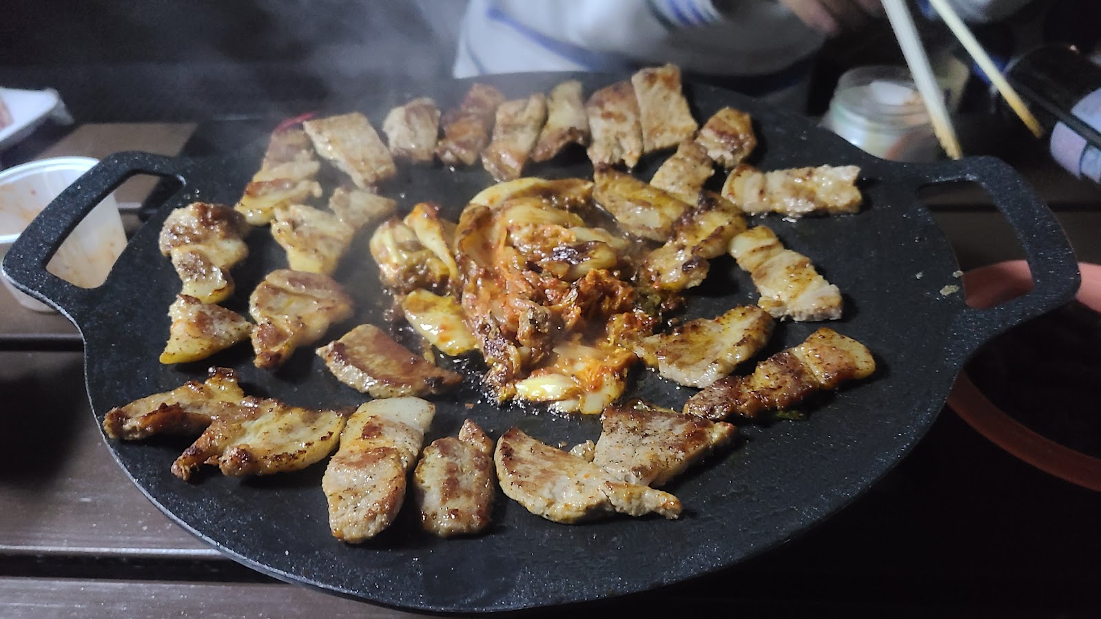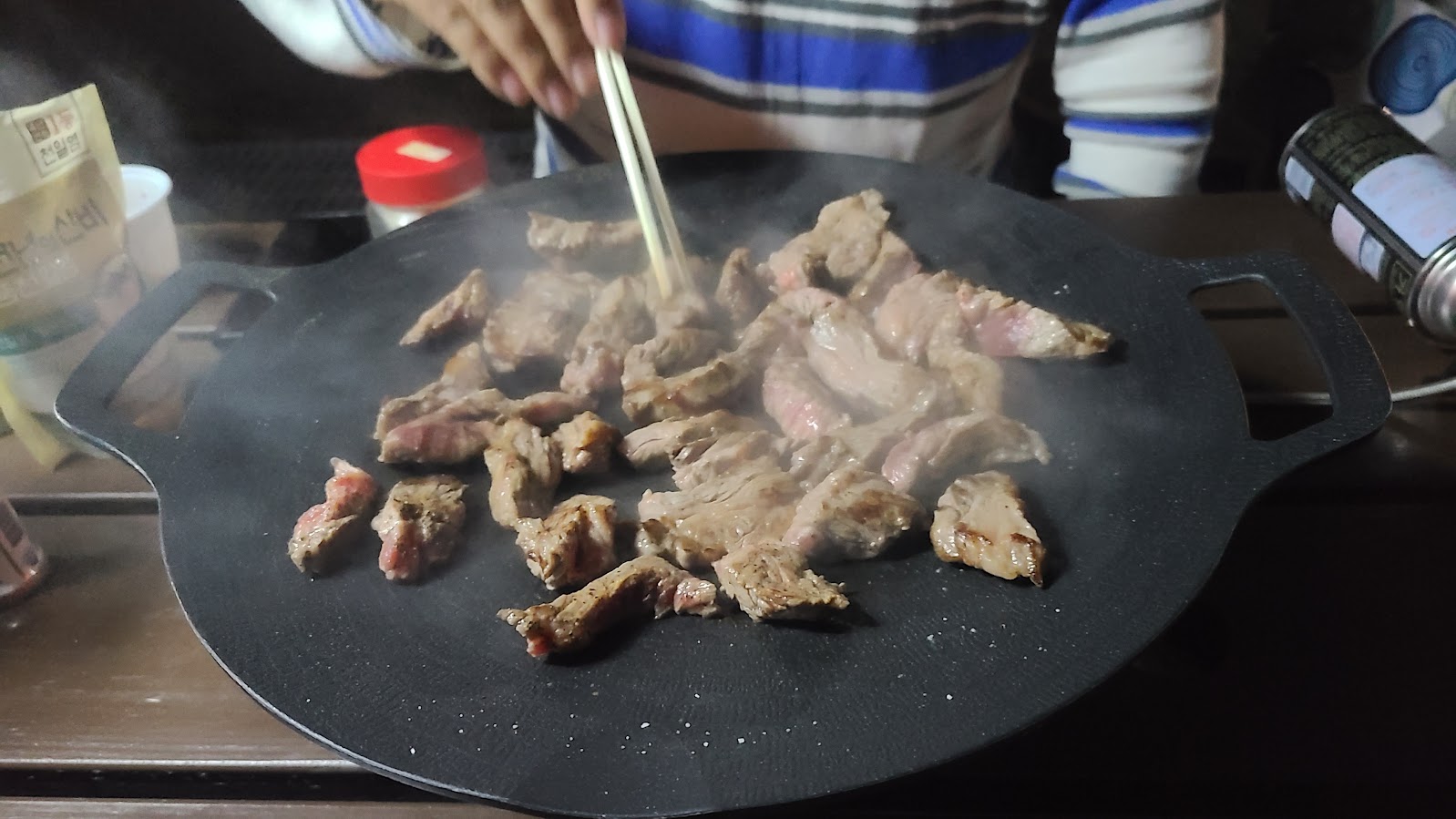 이 전등 앞에서 본격적으로 괴기를 구워봅니다. 사실 점심을 나름 배불리 먹어서(그 내용은 뒤에) 가볍게 먹을까 했으나 요리사(?)의 의중에 따라서 이번에도 괴기 파티를 벌였습니다. 물론 너무 많이 먹지는 않고 갈비살 반근 + 목살 반근 정도로 깔끔하게. 목살은 그 기름에 김치를 올려 구워서 맛있게 반찬으로 먹었습니다. 확실히 그리들은 이런 구이용으로 범용성이 좋습니다. 화력 좋은 버너와 그리들만 있어도 캠핑의 저녁 메뉴 고민이 많이 사라지기에 이건 필수 장비로 갖추심이 좋답니다.