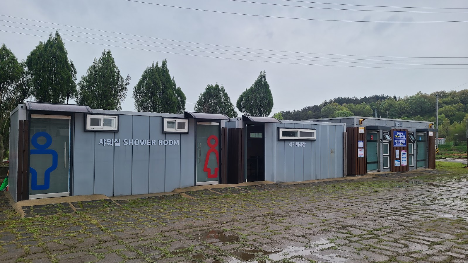 입구 옆으로 모든 부수 시설이 위치합니다. 샤워장, 개수대, 화장실 순서이며 개수대 안쪽으로는 전자레인지와 냉장고도 있습니다. 화장실 규모가 좀 작은 것이 아쉽기는 하나 개수대의 공간은 넉넉한 편입니다. 그리고 전자레인지가 좀 부족하다면... 그냥 좀 걸어서 서천 서울캠핑장 전자레인지를 빌리는 방법도 있습니다.