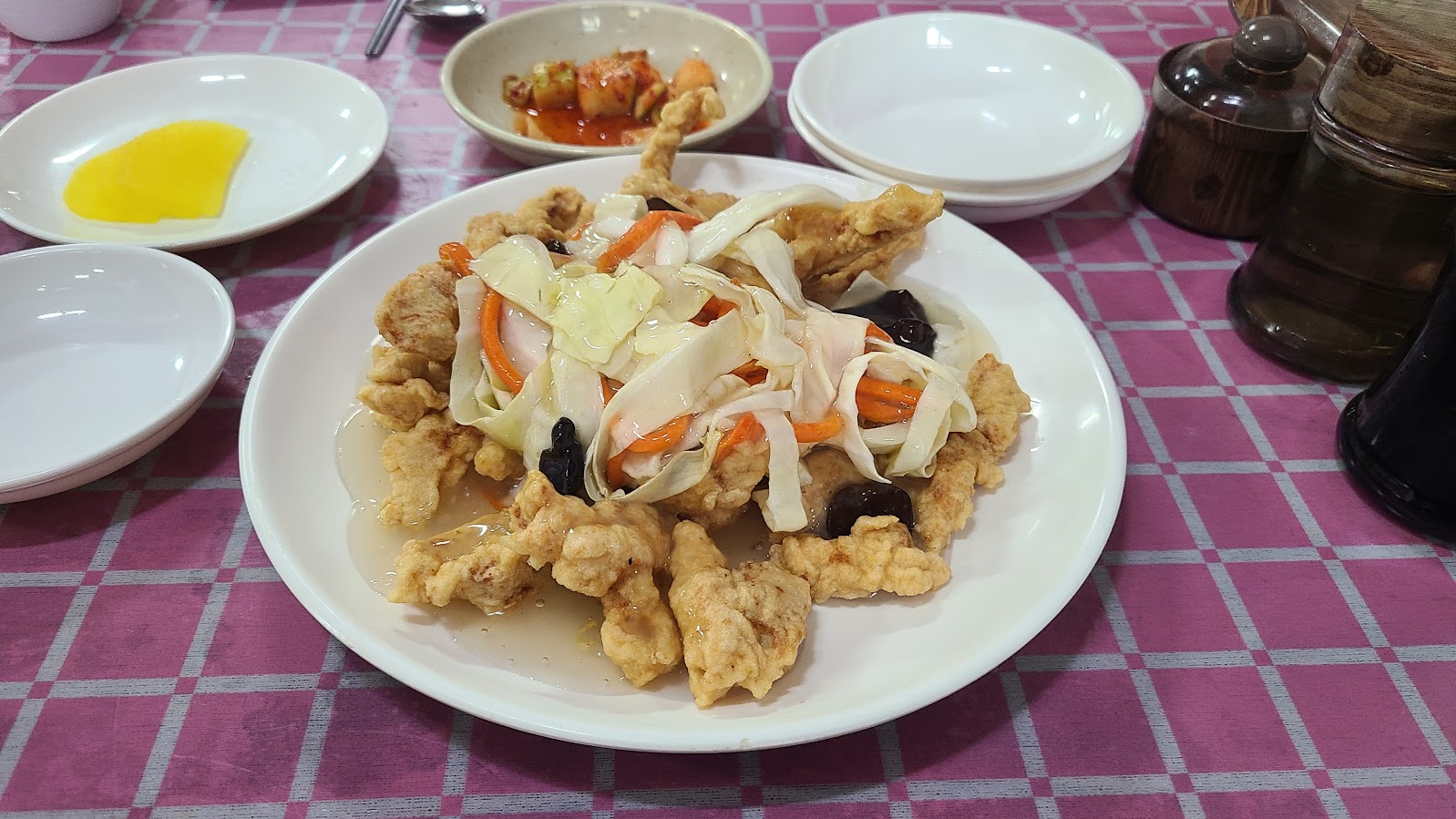 탕수육(소자 기준 15,000원)은 요즘 유행하는 찹쌀 탕수육 스타일이 아닌 1980년대 스타일의 정통 탕수육입니다. 볶먹이 아닌 부먹인 것이 좀 아쉽지만 잘 튀겨져 있고 씹는 맛도 좋습니다. 소스 스타일도 1980년대 스타일이라 심플합니다.지역 물가를 생각하면 비싼 편이라 하지만 워낙 비싼 수도권 물가를 기준으로 하면 이것도 그리 비싸게 느껴지지는 않습니다.