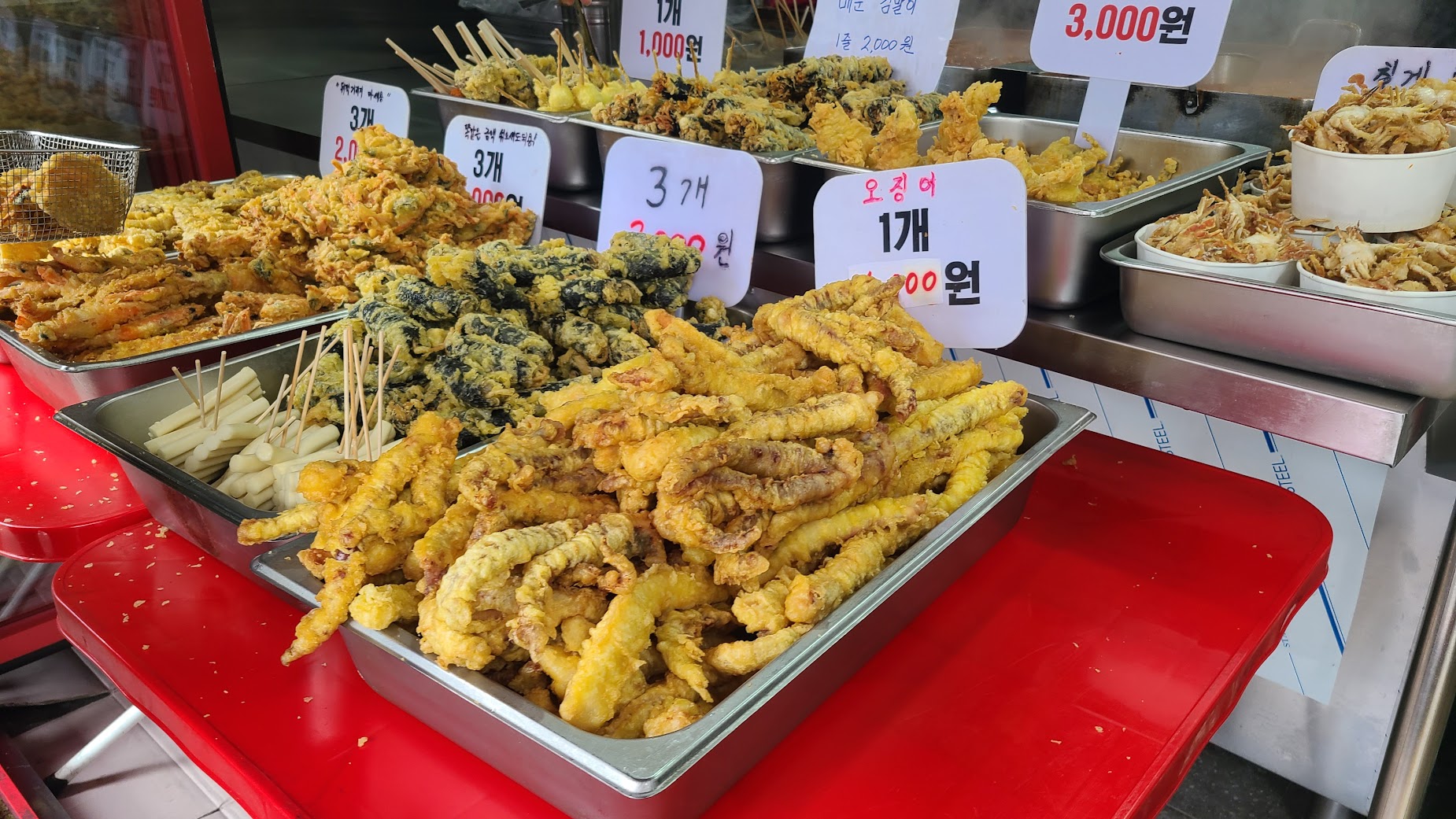 일단 캠핑을 나서기 전에 먹을 것 준비를 하고 가야죠. 도착 후 간식을 위해 남양주 평내의 모 떡볶이집으로 갑니다. 조금만 검색해도 나오는 나름 유명한 집이고, 오픈하면 줄 서서 사간다는 집입니다. 떡볶이는 그냥 국물떡볶기인데 이 집은 튀김이 메인입니다. 튀김 가격이 많이 오른게 슬프지만 다양한 튀김을 꽤 괜찮은 퀄리티로 먹을 수 있습니다. 덤으로 피카츄 돈까스도 있답니다.^^