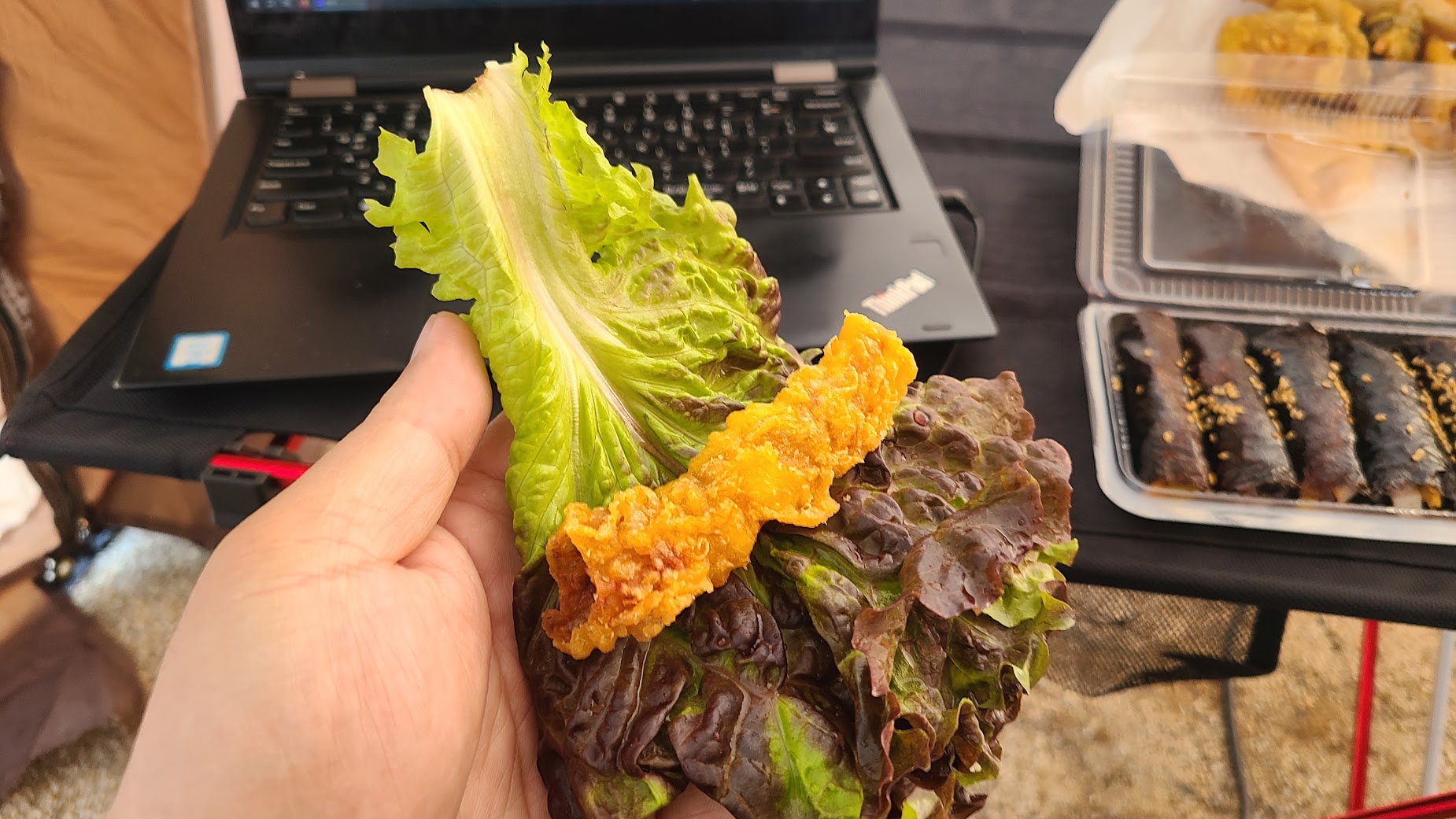 | 1. 상추와 각종 튀김을 사온다. 2. 튀김을 적당한 크기로 썰어 준비한다. 3. 고추 썰어 넣은 간장 양념장에 튀김을 찍거나 발라 올린다. 4. 상추에 싸서 먹는다. 5. ??? 6. PROFIT! |