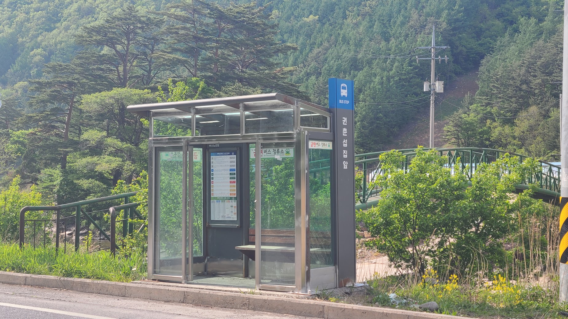 도계쪽으로 쭉쭉 가다보면 옆으로 골지천 물이 흐르고 집도 거의 보이지 않는 시점에 뜬금없이 이런 버스 정류장이 나타납니다.