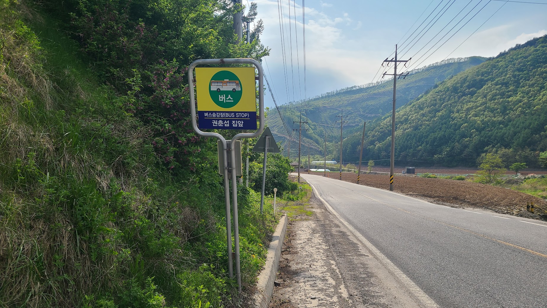 예. 대한민국 대중교통계의 성지(?)인 '권춘섭집앞' 정류소입니다. 유명인 이름도 아닌 그냥 일반인 개인의 이름을 딴 버스정류소는 대한민국에서도 여기 말고는 찾아 볼 일이 거의 없을 것입니다. 저기 앞에 보이는 다리가 그 권춘섭씨 댁이 되겠습니다. 원래는 그 부친의 자택이었고 처음 정류장 이름도 그 부친 이름을 땄지만 지금은 그 자녀분 이름입니다. 지금도 열심히 버스는 하루 몇 대씩 다닙니다. 사실 주변에 다른 집이 없다보니 아무리 저 집 혼자라고 하지만 버스정류소가 없다면 불편하긴 한 입지입니다.