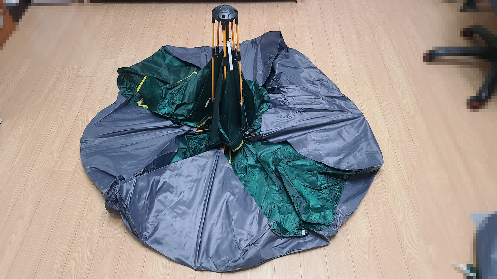 텐트를 펴는 방식은 이전 버전 2 자동 텐트와 동일합니다. 3단 우산식으로서 텐트를 세우면 이런 식으로 펴지고, 이후에 3단 다리 네 개를 펴 직립을 시키면 됩니다. 접을 때는 반대로 3단 자리부터 전부 접은 뒤 하나씩 다시 접으면 됩니다.