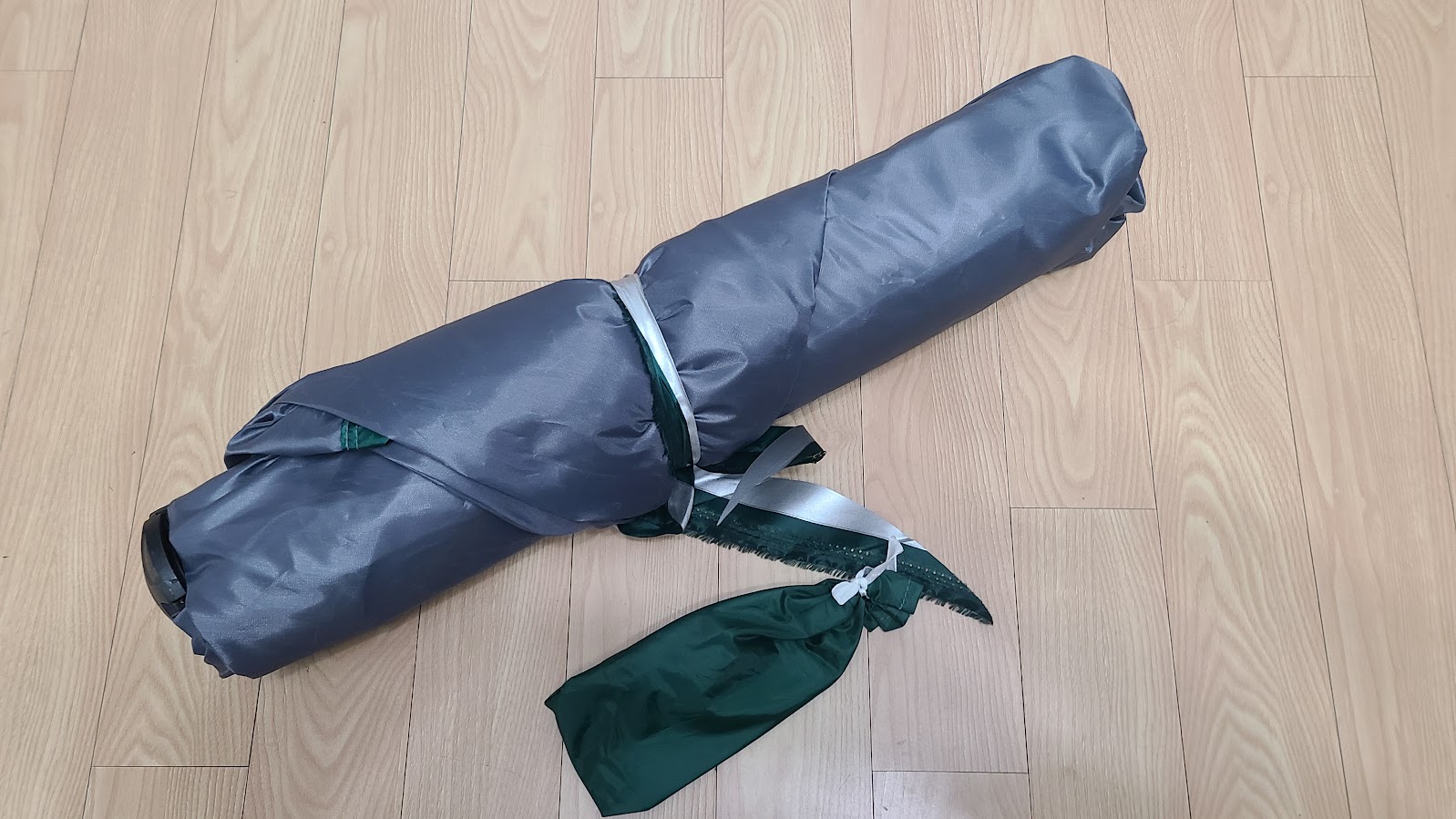 텐트 구성이 사실 거기서 거기이듯이 텐트 본체와 팩 및 스트링 가방이 전부입니다. 텐트는 그냥 자투리 천으로 대충 감아 놓았습니다. 그냥 갖다 버려야 할 것이라 실제 쓸 때는 제대로 된 묶을 방식의 준비가 필요합니다. 또한 이 가격대의 텐트가 다 그렇듯이 팩은 그냥 줘도 못 쓰는 얇디 얇은 알루미늄 팩이라 단조팩은 아니더라도 좀 더 제대로 된 알루미늄 팩을 준비해 두시는 것이 바람직합니다.