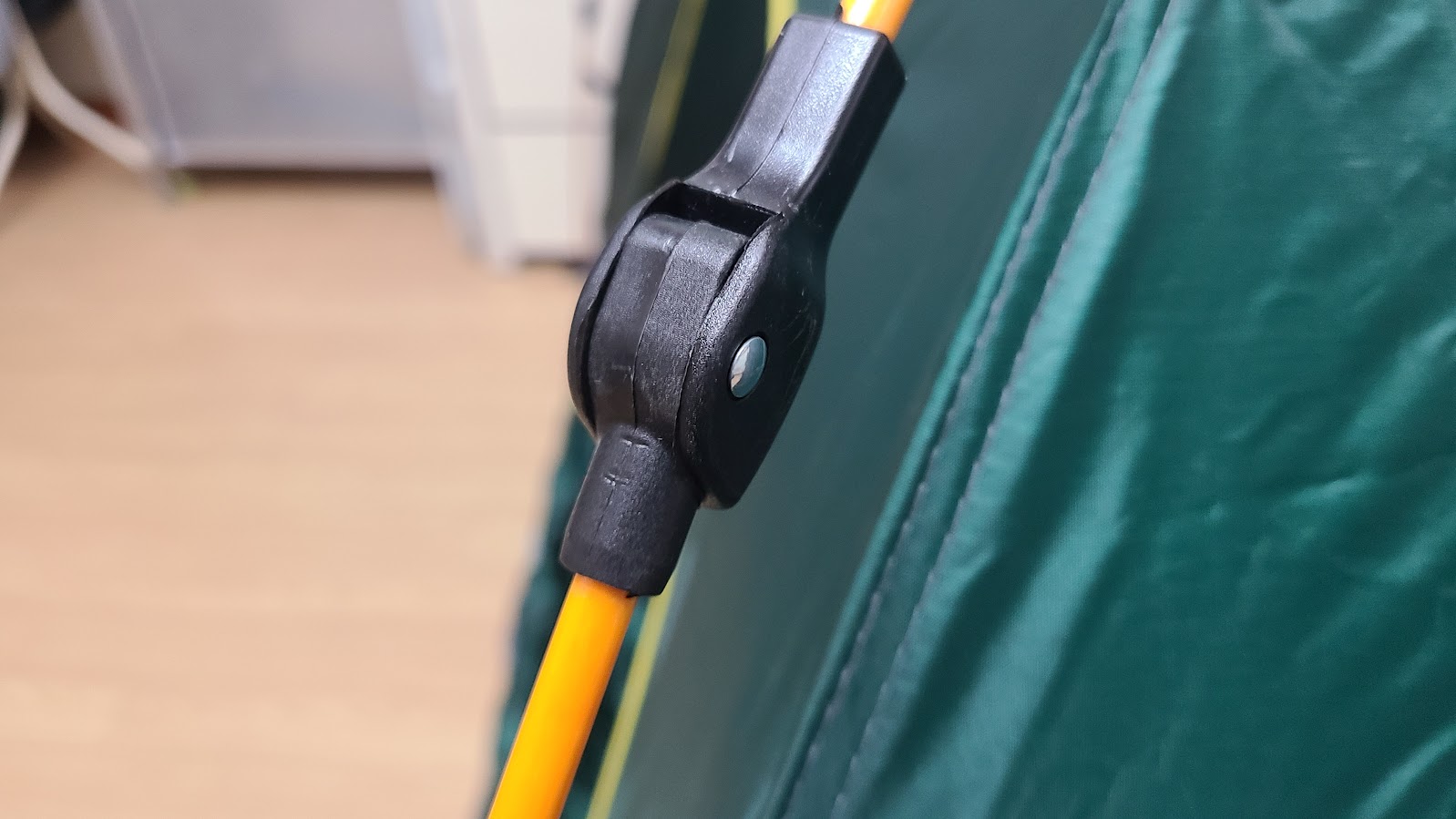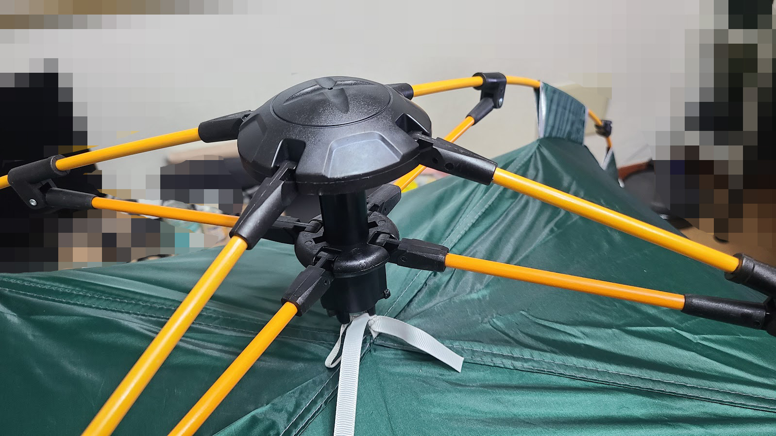 그렇지만 진짜 기존 버전 2 텐트와 다른 부분은 이 부분입니다. 사실 3단으로 접히는 부분은 겉으로는 별 차이가 없어 보이지만, 손 대면 톡 하고 꺾이던 이전 버전보다는 훨씬 지탱하는 힘이 강합니다. 더군다나 상단 역시 폴을 우산처럼 단단히 고정하는 체계가 갖춰져 있어 더욱 지지력이 강합니다. 바람이 세게 분다고 톡하고 주저앉을 걱정은 이제는 좀 덜 해도 될 듯 합니다.T_T