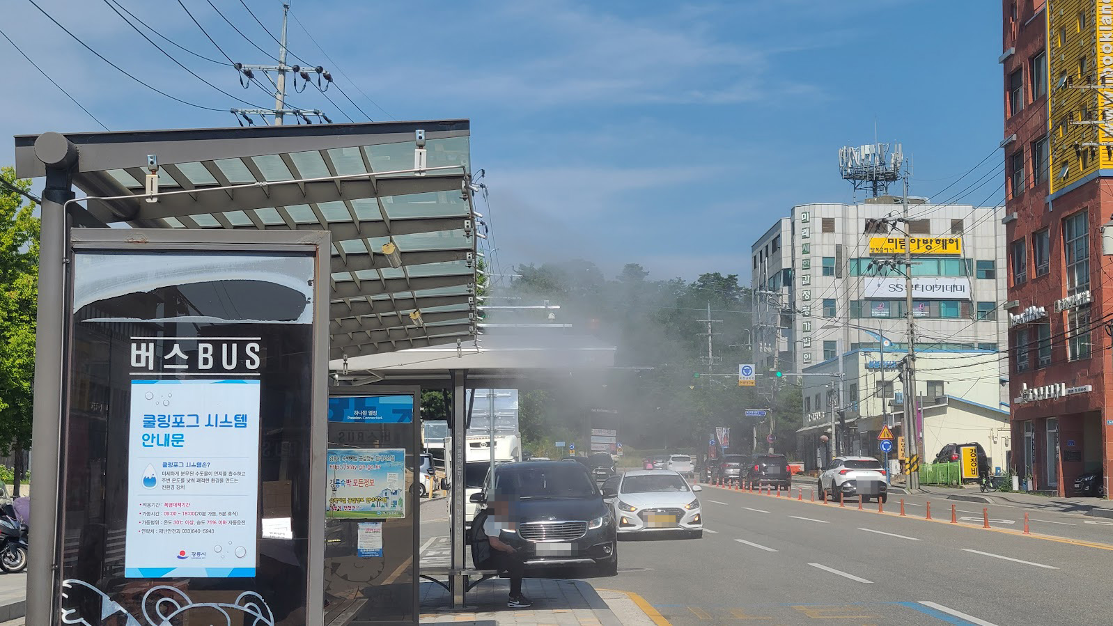 터미널 밖을 벗어나면 버스 정류장에 이런걸 보게 됩니다. 서울에서는 보기가 좀 어려운 물건인데(사실 서울은 그냥 에어컨 달린 폐쇄형 정류장을 만들어서 보기 어렵습니다.), 정류장에 수돗물 뿌려주는 물건입니다. 물을 뿌리면 주변의 열을 빼앗아 조금이나마 시원해지는 효과를 보는 것인데, 강릉에서도 일부 정류장에 이런게 적용되어 있습니다. 다만 문제점은 바람 방향에 따라서 효과가 반감될 수 있다는 것, 그리고 습도가 너무 높으면 오히려 불쾌지수가 올라간다는 것입니다. 습도와 온도를 고려해서 작동을 결정한다 합니다만 이건 기술의 근본적인 한계죠.