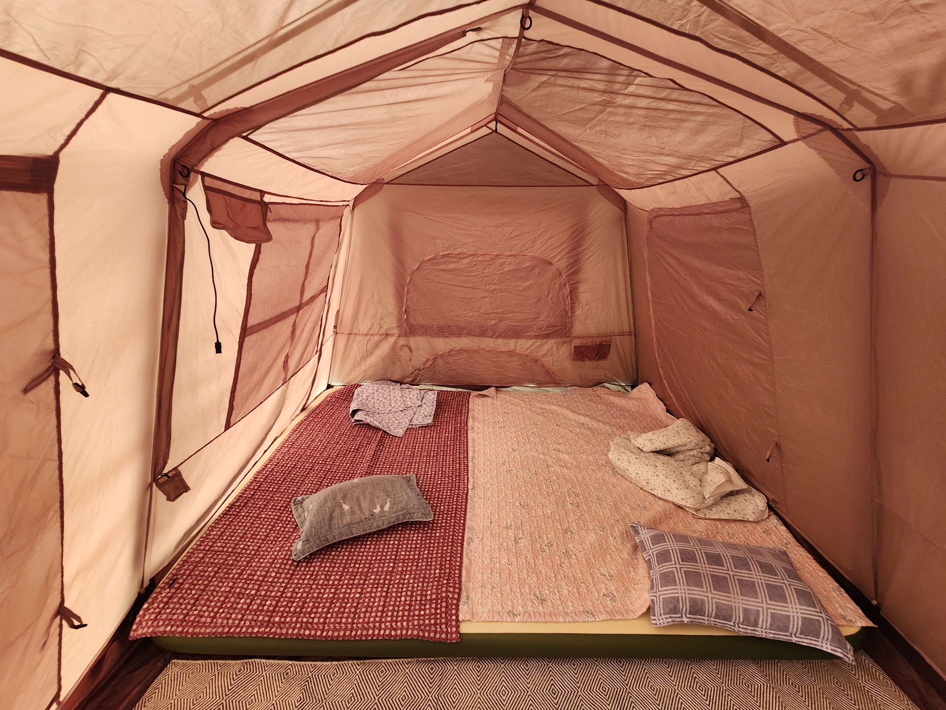추가로 에어매트도 새로 장만했습니다. 이게 텐트 가격보다 비쌉니다.T_T 그래도 두 명이 데굴데굴 구를 수 있는 크기에 Village 13의 공간 절반을 차지합니다. 나머지 공간에는 이케아표 러그를 깔아서 뭔가를 할 수 있게 했습니다. 자충매트와 달리 공기를 빼고 넣어줘야 하는 단점은 있지만 일단 접었을 때 공간이 상대적으로 적게 차지하며 공기를 빵빵하게 채우면 나름 빵빵한 편안함을 자랑합니다. 이걸 전동 펌프로 하려면 소음이 문제입니다만.