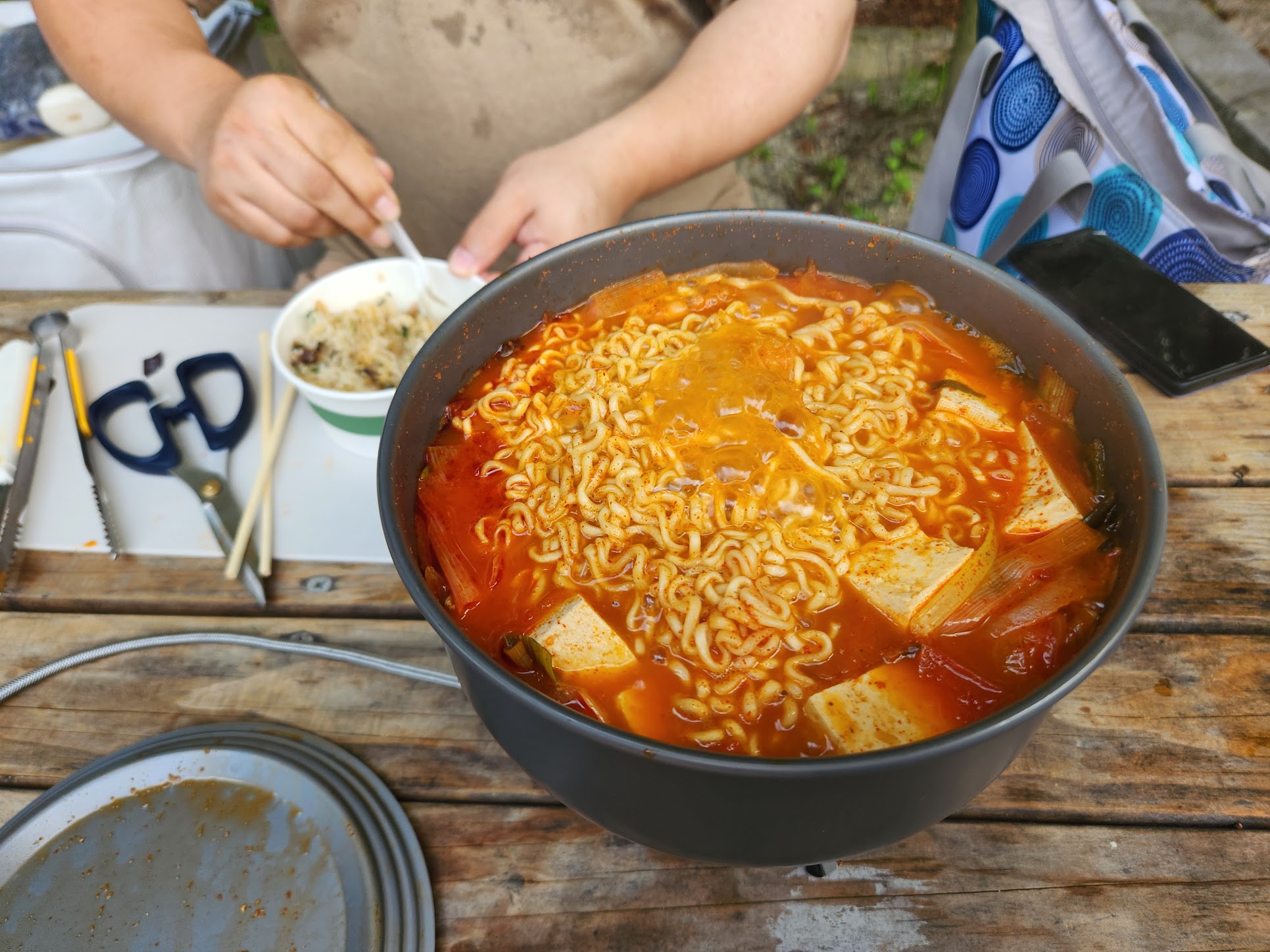 물론 저 안에서 그냥 답 없이 쪄죽은 것은 아니라 에어컨 + 선풍기를 풀 가동했지만 그래봐야 기온을 몇 도 낮추는 효과만 있습니다. 제습 효과 역시 저렇게 습도가 높아서야 다 잡지 못합니다. 무엇보다 텐트는 그 구조상 외부 공기 차단도 쉽지 않구요. 그래서 목욕을 했음에도 끈적끈적해지는 피부를 참아가며 버텨야 했습니다. 그리고... 이제 밥을 먹어야죠.