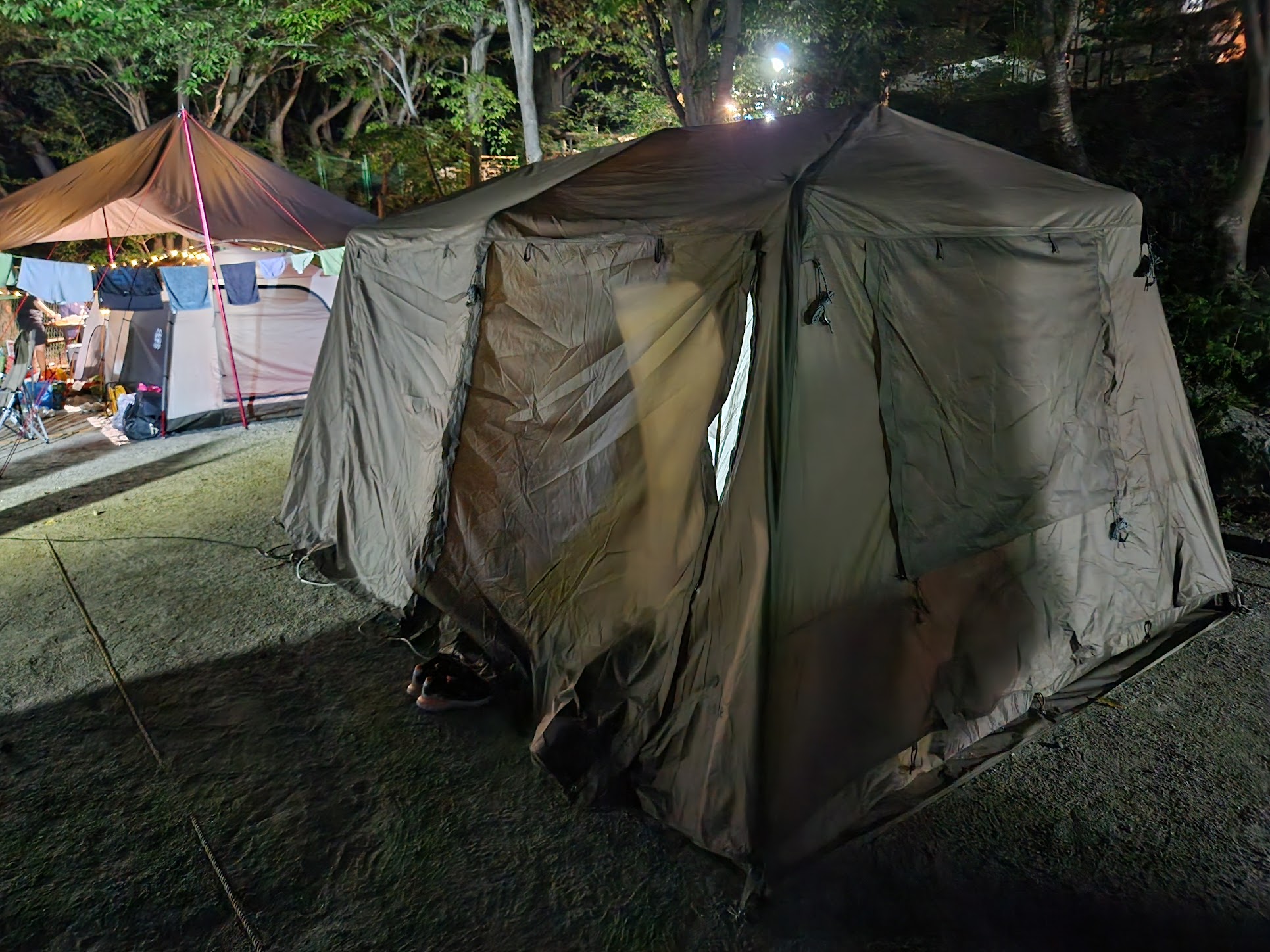 다만... 아무리 텐트를 치는 데 시간이 줄어든다 해도 섭씨 33도, 여기에 시내 기준으로도 체감 온도가 3도 이상 오르고 습도가 답이 안 나오게 오르는 산 밑인 동학사는 그 이상 체감 온도가 올라서 그 시간에 체력은 방전됩니다. 일단 배 위로는 그냥 물이 쫙쫙 나오죠. 거기다 그 짧은 시간동안 펄펄 끓는 텐트 내부에서 나머지 작업을 할 용기는 없습니다. 이미 땀에 절은 옷을 갈아 입는 정도로는 답이 없습니다. 그래서...