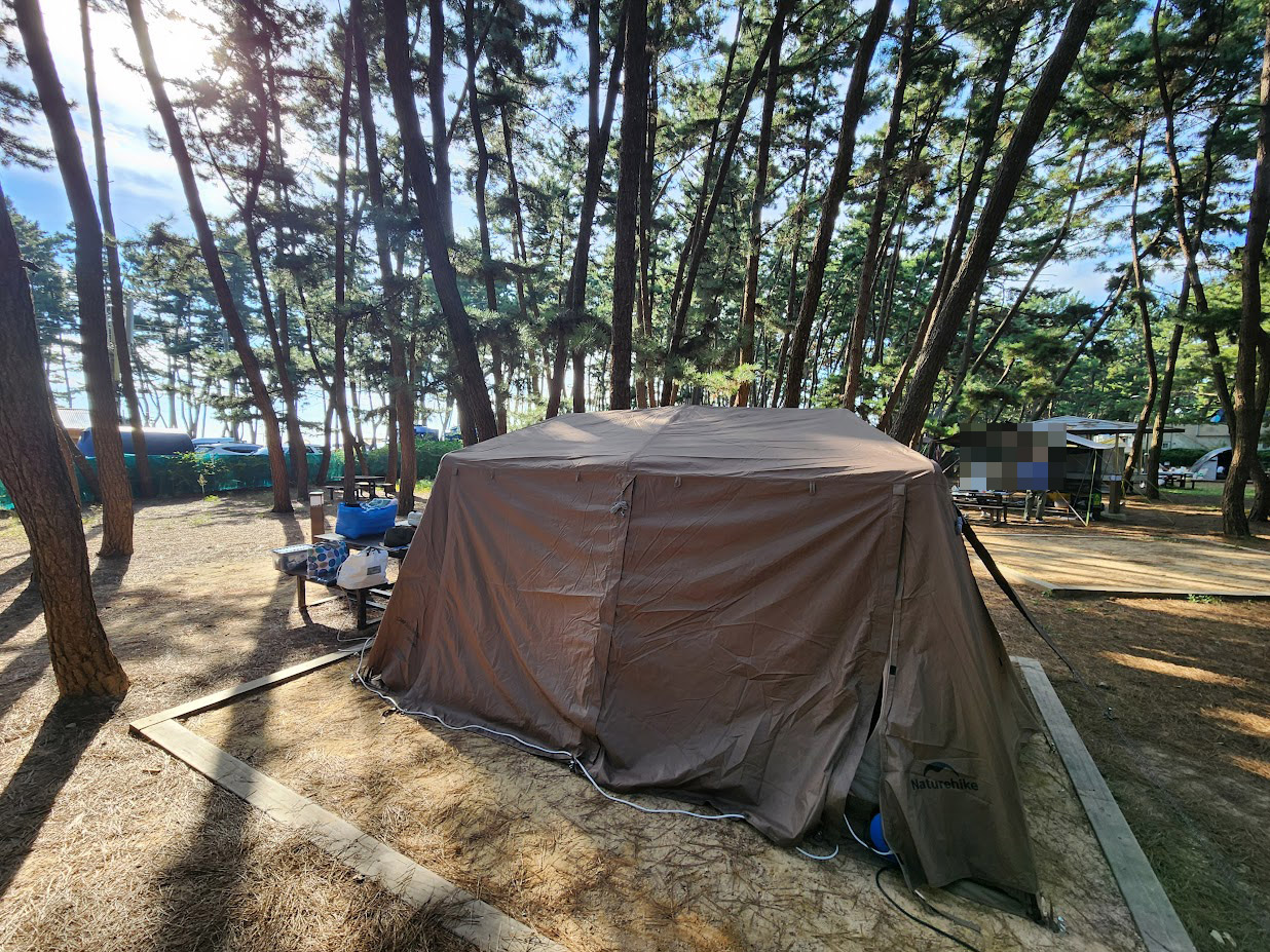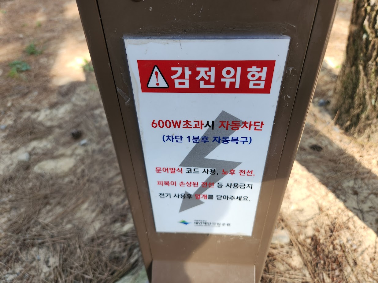 나무 테이블은 기본 제공이라 장비가 충분치 않은 초보 캠퍼도 텐트와 침구류, 조리기구만 있다면 충분히 올 수 있습니다. 다만 문제는... 전기가 너무 짭니다. 학암포도 그렇지만 600W 칼제한이 들어가 600W를 1W라도 넘는 순간 브레이커가 떨어집니다. 이 때문에 가져간 커피 머신은 써보지도 못했습니다.T_T 전기장판 이외의 전기 난방은 아예 생각조차 말아야 합니다.