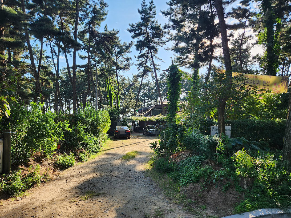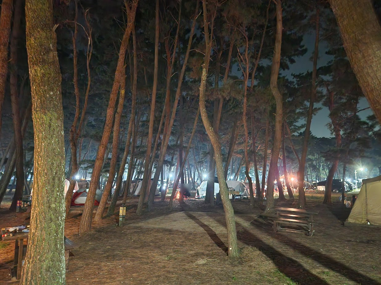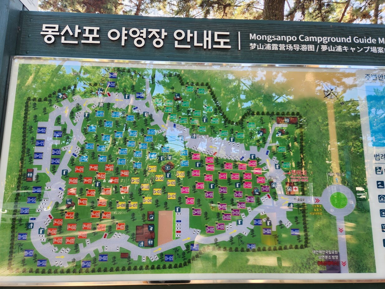 이 사진 하나가 이 캠핑장의 구조를 어느 정도 설명해줍니다. 몽산포 캠핑장은 전형적인 숲 캠핑장입니다. 그것도 진짜 숲 캠핑장입니다. 숲 느낌만 나는게 아닙니다. 도로를 끼고 영지가 배치된 오토캠핑장이 아니라 정말 나무 사이에 영지가 들어 있는 숲 캠핑장하면 생각하는 그 배치입니다.