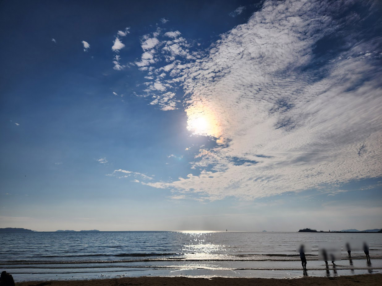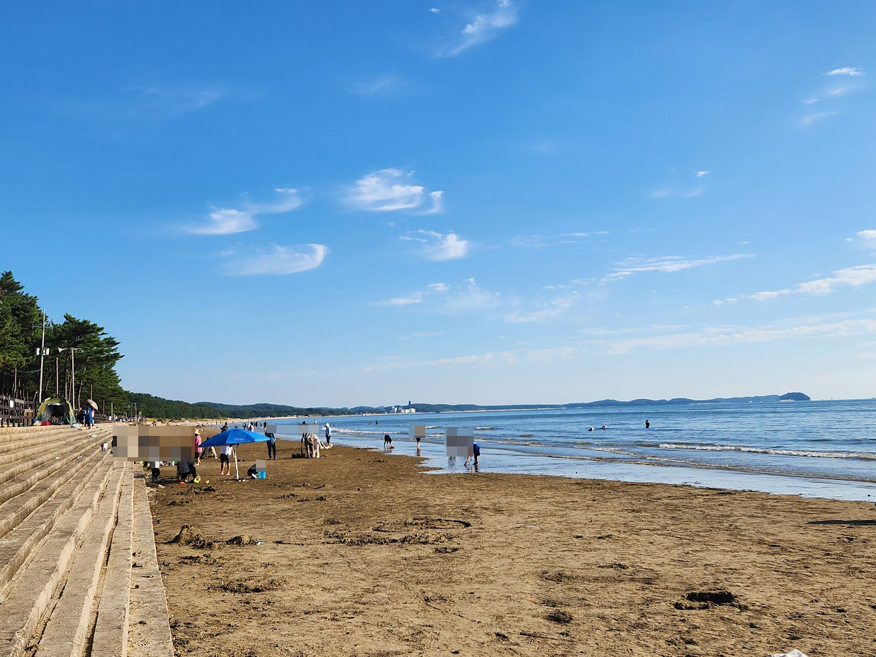 지금은 조개 캐고 게 잡는 시즌이라 다들 바쁜데, 몽산포는 해변이 폭은 좁은데 긴 구조입니다.그래서 모래밭을 매우 길게 걷지 않아도 파도 치는 바다를 바로 볼 수 있습니다.