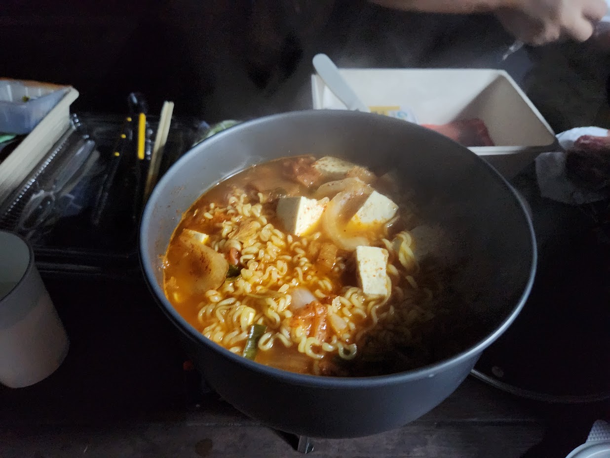 아침은 하기 쉽고 치우기 쉬운게 짱입니다. 저건 육수가 필요 없어서 그냥 재료를 투입하고 적당히 맹물 붓고 끓이면 끝납니다. 푸짐한 햄과 소시지, 브랙퍼스트 소시지와 라면이 반깁니다. 진하면서도 쑥갓이 들어 있어 아주 약간은 시원한 맛이 납니다. 이걸로 밥통에 새로 지은 밥도 다 털었습니다.