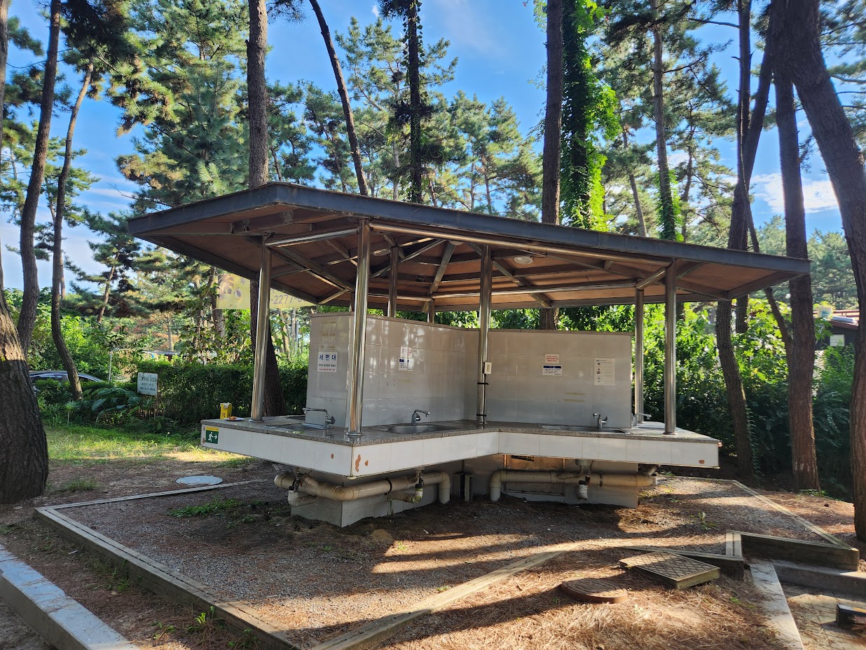 부족한(정확히는 너무 거리가 먼) 화장실과 달리 개수대는 그렇게 멀지 않고 적절한 거리에 하나씩 배치되어 있습니다. 물론 실내 개수대는 제한적이라 동계에는 물 쓰기가 번거롭게 되지만, 지금 시즌에는 걱정할 것이 없죠. 개수대는 세면대를 겸하게 되어 있어 세면대 영역이 따로 있습니다.