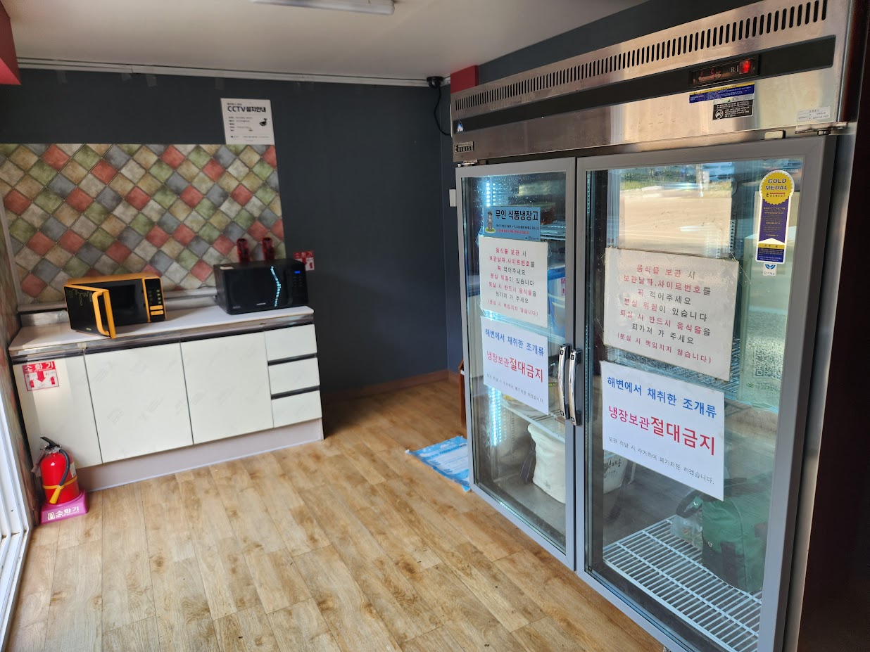 이 중앙 화장실 옆에는 안내표에는 매점이라고 기재된 곳이 있습니다. 실제로는 매점은 없고 현 시점 기준으로 운영하지 않는 아이스크림 자판기와 전자레인지, 공용 냉장고가 있습니다. 전자레인지가 있으니 냉동식품 조리도 그런대로 할 수 있습니다. 영지가 구석에 있다면 불편은 하겠지만 없는 것 보다는 낫죠. 공용 냉장고는 크기는 크지만 시원한 것과 거리가 멀어 그냥 부패만 막아주는 용도라 생각하시면 됩니다.