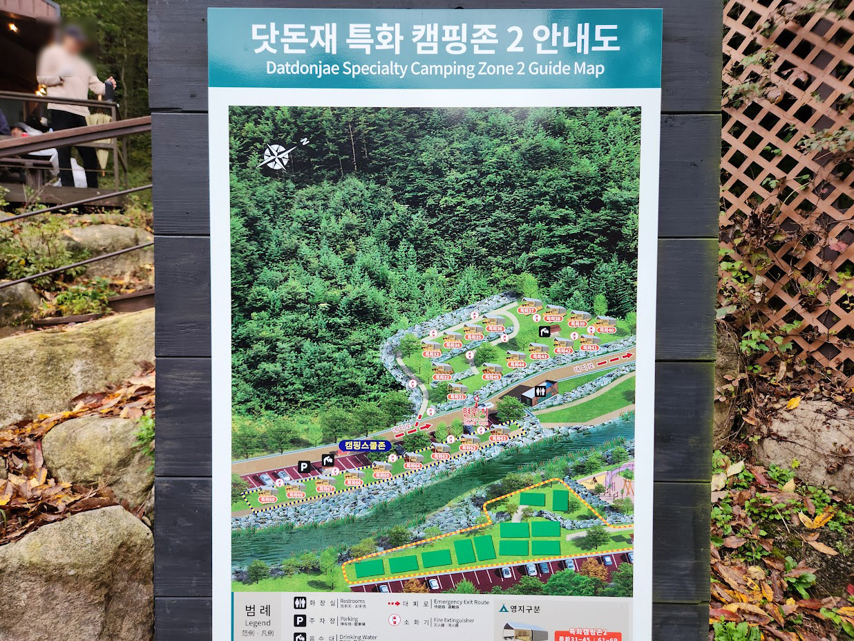 캠핑장 전체 크기가 커서 전체 푯말도 확인하기가 꽤 힘듭니다. 그냥 대충 지리가 저렇게 생겼다 보시면 되고, 0시부터 시계방향으로 각각 자동차캠핑장2, 특화캠핑장1, 자동차캠핑장1, 특화캠핑장2가 됩니다.