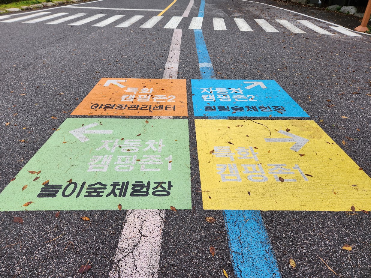 캠핑장 입구에 들어서면 바닥에 이런 표기가 붙습니다. 이는 시설에 대한 방향 안내이기도 하지만 '4색야영장'이라는 이름의 유래이기도 합니다. 굳이 쪼개서 설명하면 캠핑장이 네 곳이 되기 때문입니다.