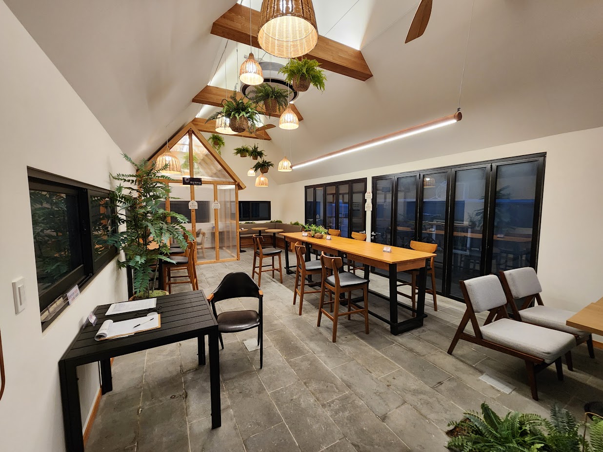 일종의 카페와 같은 디자인으로 책상에는 콘센트가 배치되어 있어 노트북 PC를 쓰기에는 편합니다. 안쪽에는 화상회의실도 있구요. 입구의 일지만 작성하면 누구나 쓸 수 있습니다. 다만 그냥 조용히 일을 본다는 목적 말고는 꼭 여기를 고집할 필요는 없는데, 일단 캠핑장 전체에서 무선 인터넷이 되기 때문입니다. 그래서 그냥 자기 영지에서 노트북 PC 펼쳐놓고 물소리 들으며 일을 해도 됩니다.