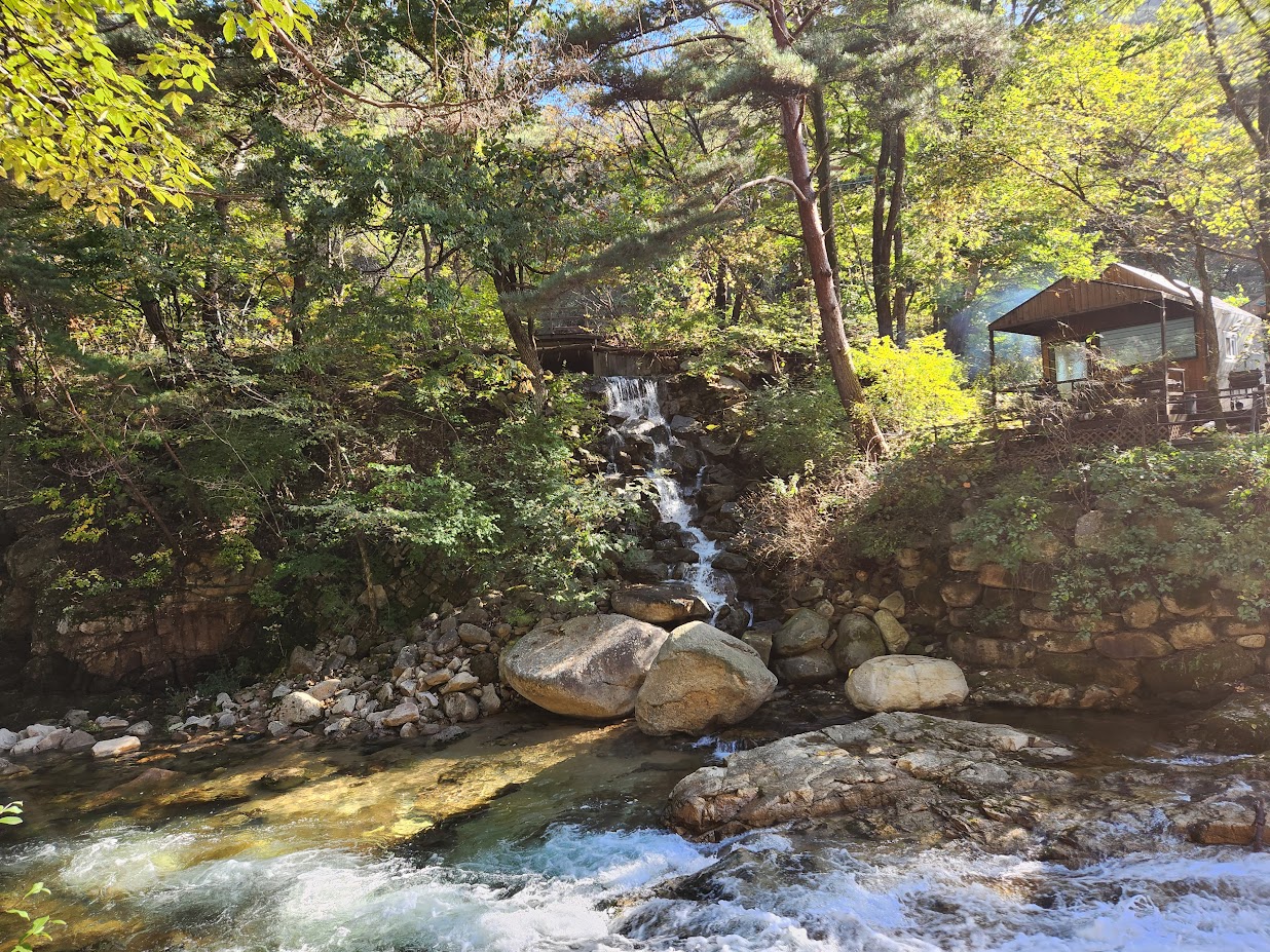 꽤 수량이 풍부한 냇가를 캠핑장 가운데 끼고 있어 여름에는 물놀이하기 좋고, 나머지 계절에는 물소리를 들으며 캠핑을 할 수 있습니다. 아래 사진처럼 반대면(특화캠핑존 2) 구석에는 작은 폭포도 있습니다. 물소리를 듣는 낭만 캠핑을 원하신다면 이 물가와 가까운 자리를 잡는 것도 좋겠죠.