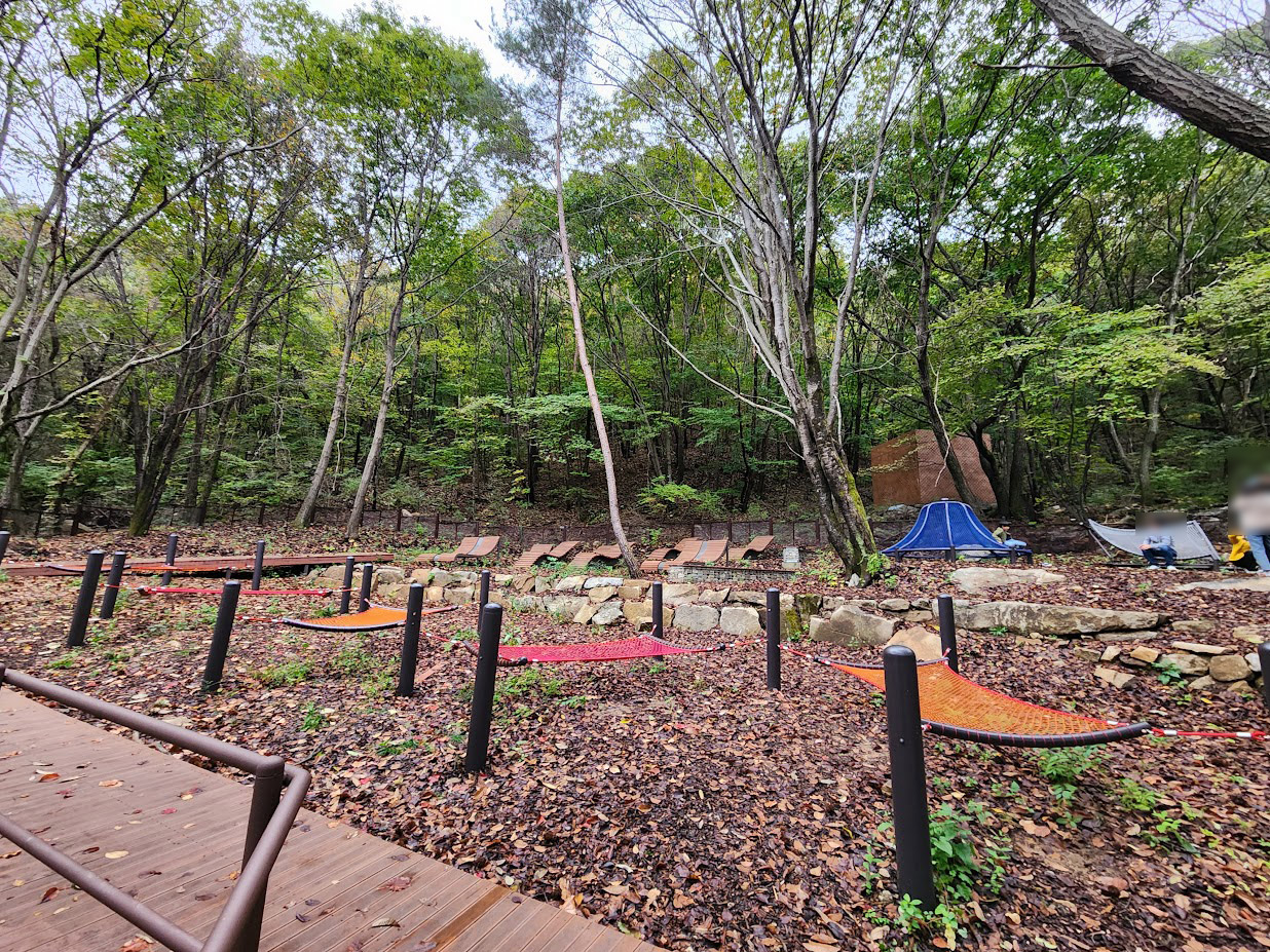 이 캠핑장 중간에는 힐링숲 체험장이라고 있는데 대단한 것은 아니고 그냥 숲 속에 썬체어와 해먹 갖다 놓은 것 뿐입니다. 즉 그냥 누워서 일광욕(?)하라는 의미죠. 지금도 낮에는 할만하지만, 이 날은 비가 왔습니다. 예. 올해 캠핑은 절반은 비와 함께 하는 징크스는 이어집니다.T_T