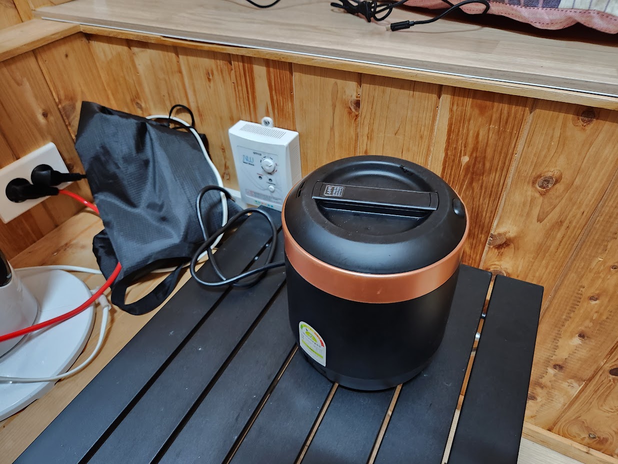 잘 때는 전기 온돌 덕분에 적당히 따뜻하게 잤지만, 전체 공간의 한 구석만 뜨거워지는게 나름 문제라면 문제였습니다. 그래도 춥지 않게 잘 수 있는게 어딘지요...