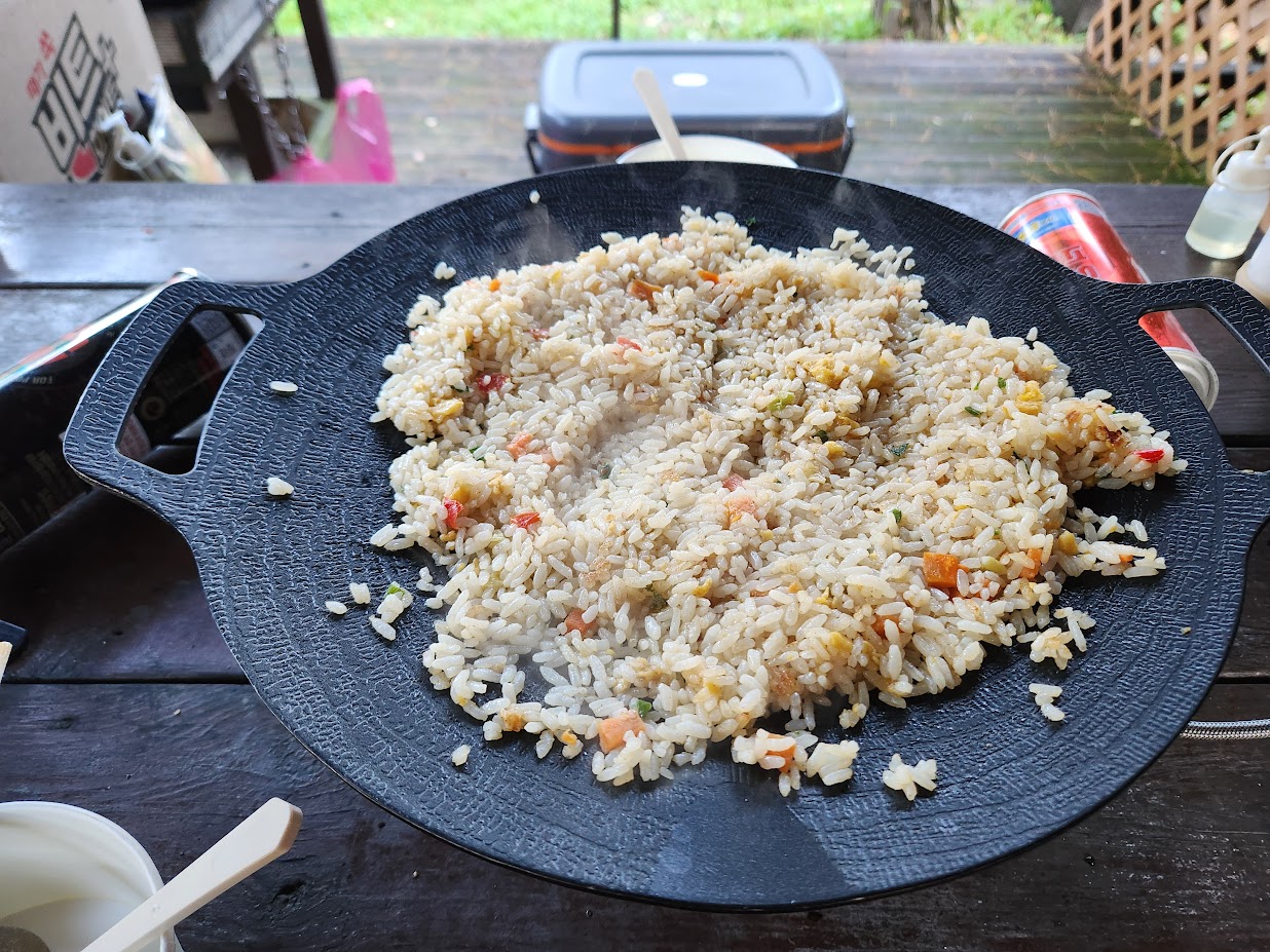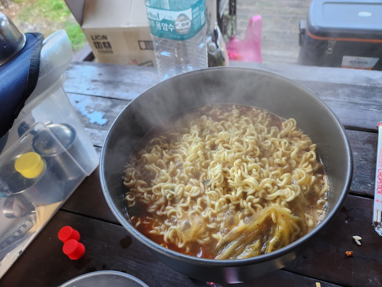아침은 그냥 계란 볶음밥에 감자탕면(?)이 나옵니다. 남은 감자탕 국물을 없앨 목적으로 라면 사리를 투입한 것인데 사실 맛은 좀 그렇지만 먹어서 없애야죠. 계란 볶음밥은 볶기만 해도 퀄리티가 나오죠. 이후 커피까지 쭈욱~ 들이키고 한 시간동안 다시 아침 산책을 한 뒤 캠핑장을 나섰습니다.