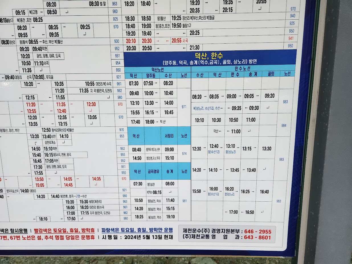 그 버스도 덕산면 사무소까지만 갑니다. 참고로 그 덕산면이 어딨냐... 제천 시대는 저기 위인데 덕산면은 월악산 바로 위입니다. 제천을 가야 시외버스를 타건 기차를 타건 할 수 있는데 덕산면에서도 한~~~참 먼 곳입니다. 오히려 충주가 더 가까울 정도인데, 농담이 아니라 캠핑장이 있는 한수면에서 조금만 서쪽으로 가도 충주입니다. 보통 이런 시군 경계 지역은 교통이 매우 안 좋은데, 이 동네 역시 마찬가지입니다. 시간을 잘 맞춰 환승에 환승을 해야 겨우 갈 수 있는 곳이라 정말 하드코어할 수 밖에 없습니다.