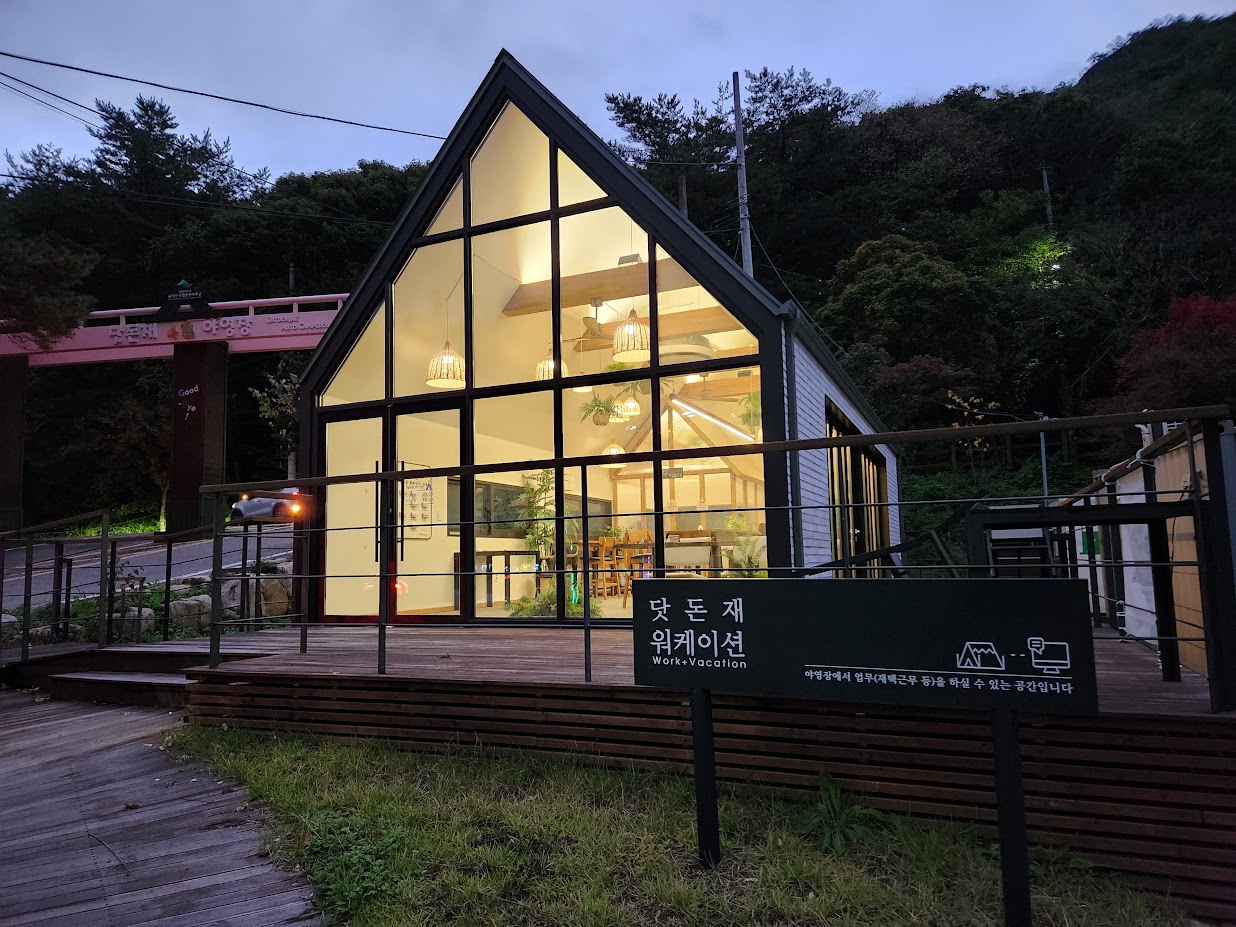 아, 그리고 입구에 있는 시설 하나를 소개합니다. '워케이션'이라는 곳인데, 재택근무용이라고 써 있는데 엄청나게 대단한 것은 아니고, 그냥 사무 및 회의 공간입니다. 오전 9시부터 오후 6시까지 쓸 수 있습니다.