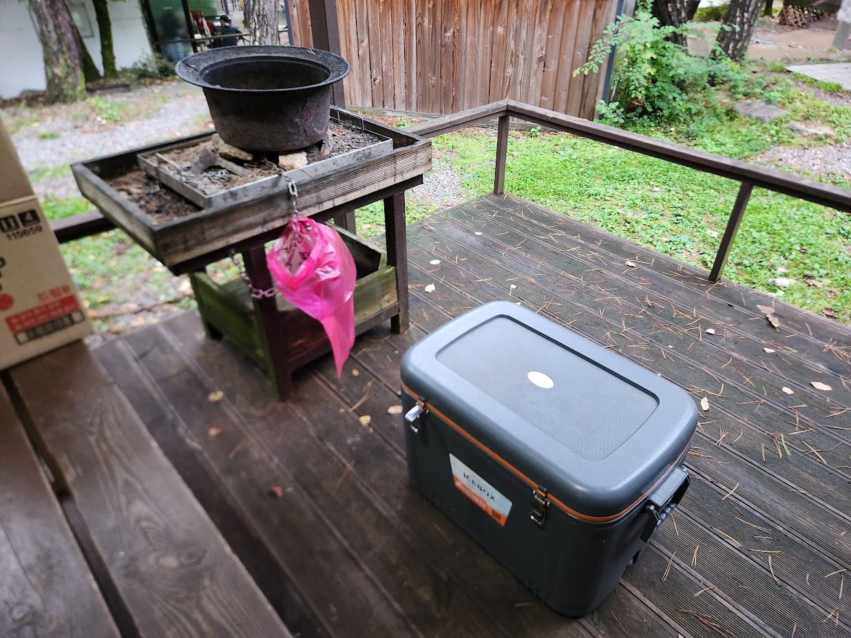 카라반이 아니라서 냉장고는 기대하시면 안 됩니다. 위 사진처럼 나무 테이블이 제공되고, 냉장고 대신 대형 아이스박스가 놓여 있습니다. 화로대는 고정형으로 작은 것이 있는데, 작은 장작을 때기에는 충분합니다. 나무 바닥이라 개인 화로대를 놓고 쓰는 것은 극히 권장하지 않습니다.