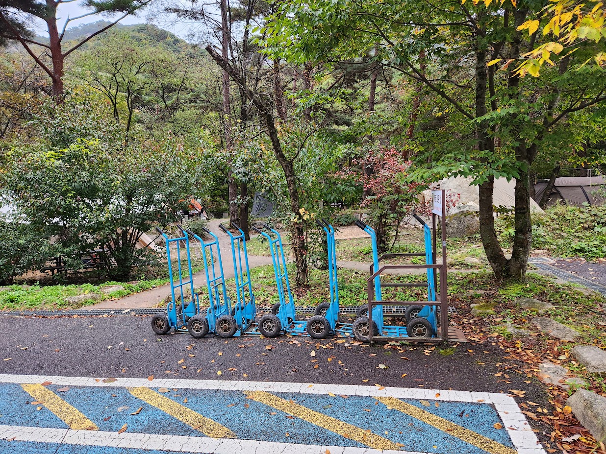 주차는 모든 영지 공통으로 별도 주차장에 주차 후 영지로 이동하는 일반 캠핑입니다. 자동차캠핑존이라고 하여 오토캠핑이 아닙니다. 주차 공간 자체는 꽤 넉넉합니다. 그리고 카트를 대여해주는 만큼 짐을 전부 짊어지고 끙끙대는 수고는 덜합니다. 이거 없었으면 정말 힘들죠.T_T