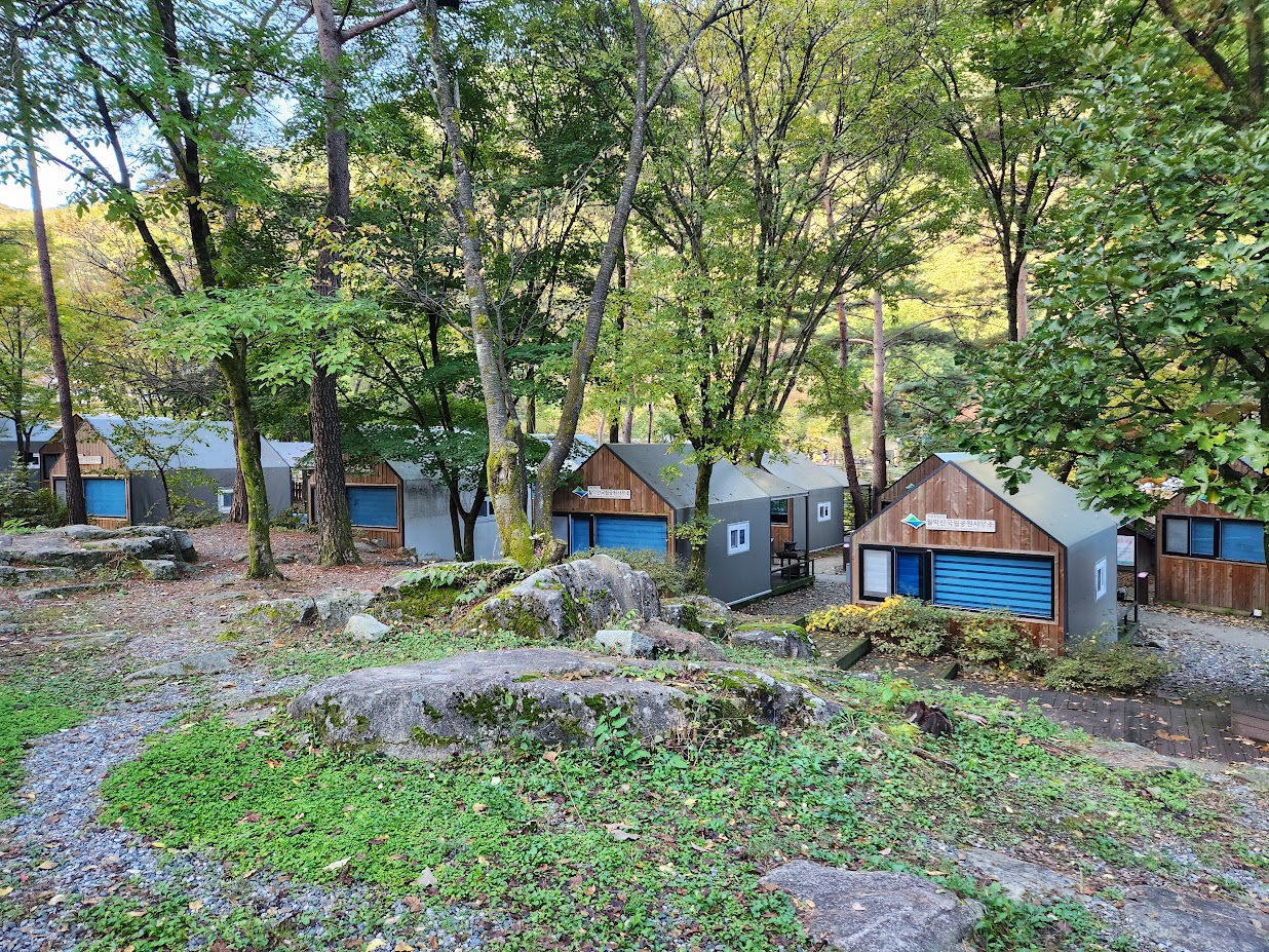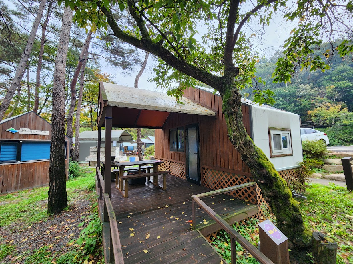 이번에 묵는 곳이 여기인데, 특화캠핑존이라고 해도 완전한 풀옵션, 즉 카라반은 없습니다. 1캠핑존은 하우스, 즉 나무로 된 집이며(실제로는 카라반 개조), 2캠핑존은 산막텐트입니다. 외부 재질 이외에도 내부 시설이 좀 다릅니다.