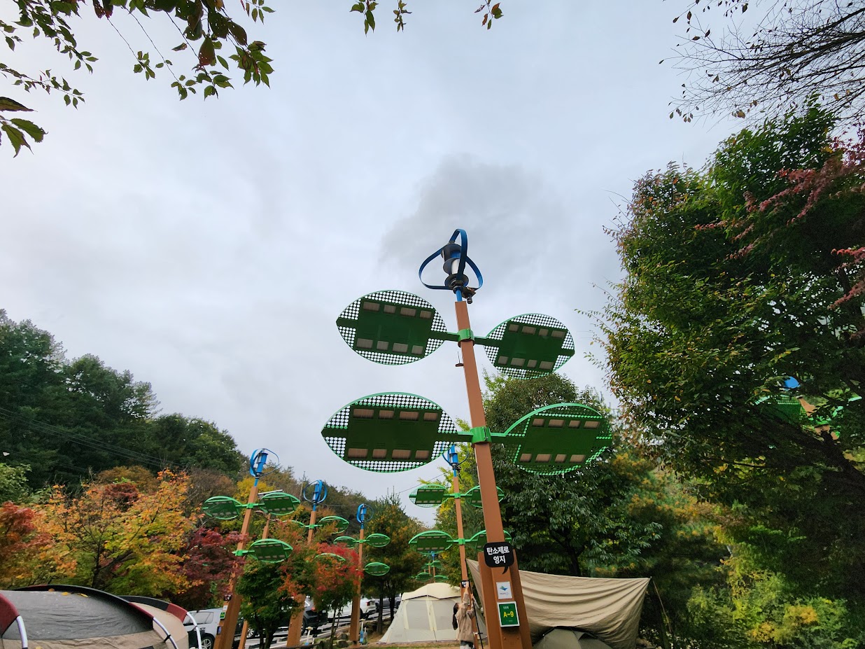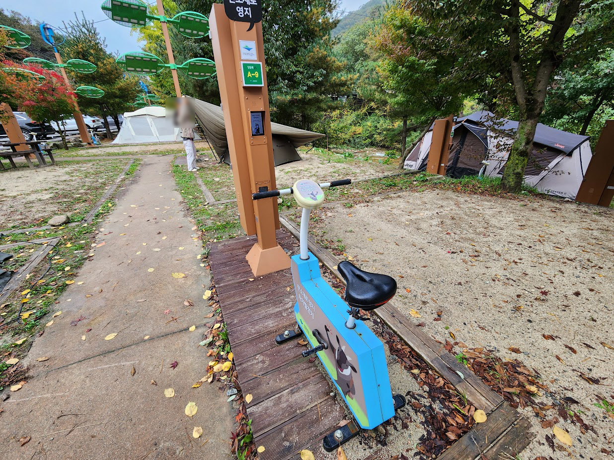 이 영지는 '탄소제로영지'로 부르는데, 캠핑장의 전력을 풍력과 태양광으로 보충하는 컨셉입니다. 전기가 부족하면 죽어라 자전거 타라 이거구요. 정말 전기 부족하면 전기가 나가는지 여부는 확인되지 않았으나... 이 영지 가운데 6개는 친환경차 전용이라 전기차/수소연료전지차를 타고 오거나 대중교통으로 올 분만 예약이 가능합니다. 예약할 때 이 부분 나와 있으니 꼭 읽어 보셔야 합니다.