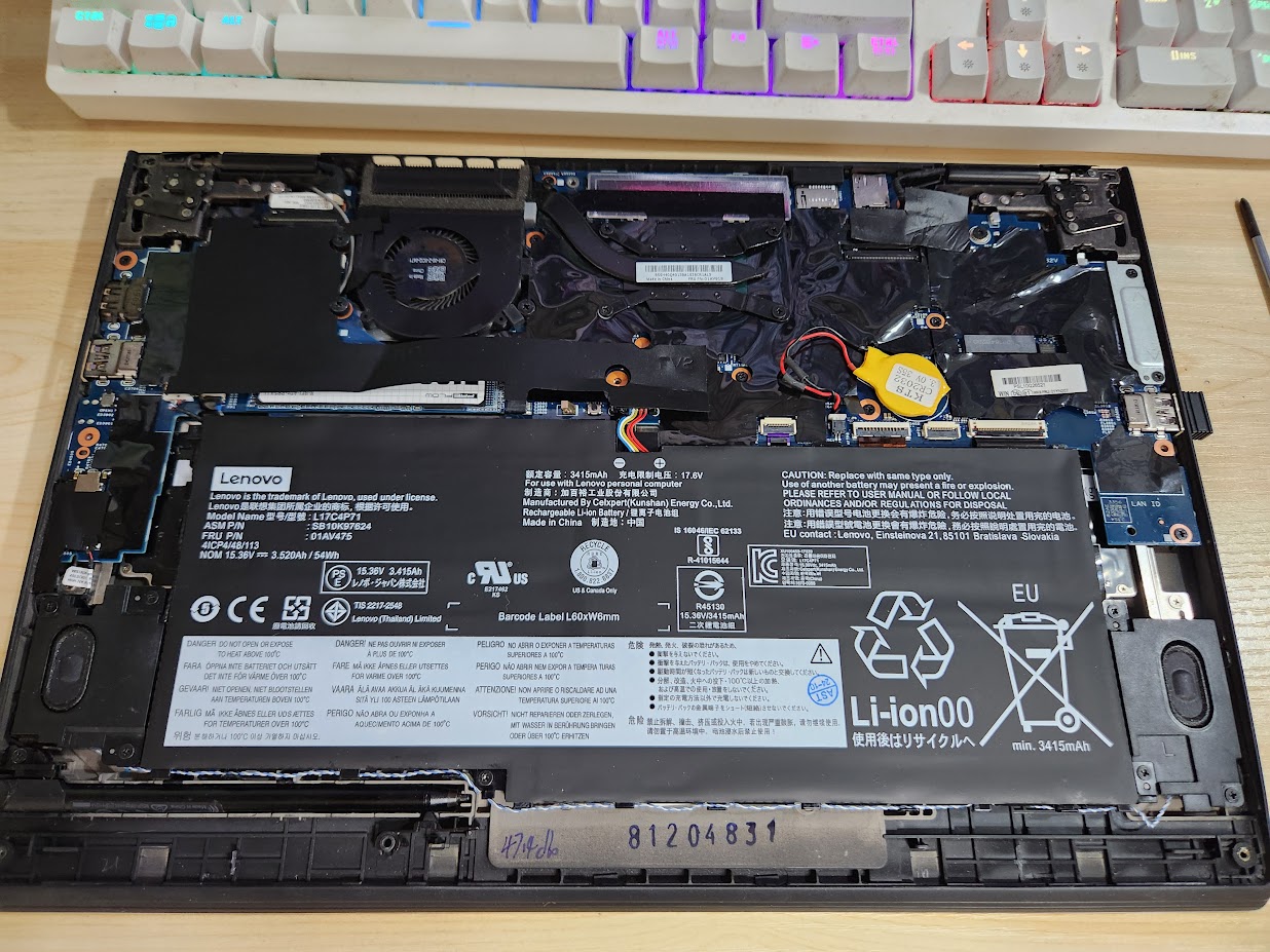 그러면 이런 속이 보입니다. 아래에 배터리와 양쪽으로 내장 스피커가 보이고, 그 외에는 보호 비닐로 가려져 있지만 SSD와 무선 LAN/블루투스 어댑터가 있습니다. 그 위에 있는게 냉각팬이요 오른쪽에 있는게 CPU입니다. 이건 굳이 지금 뗄 필요가 없습니다.