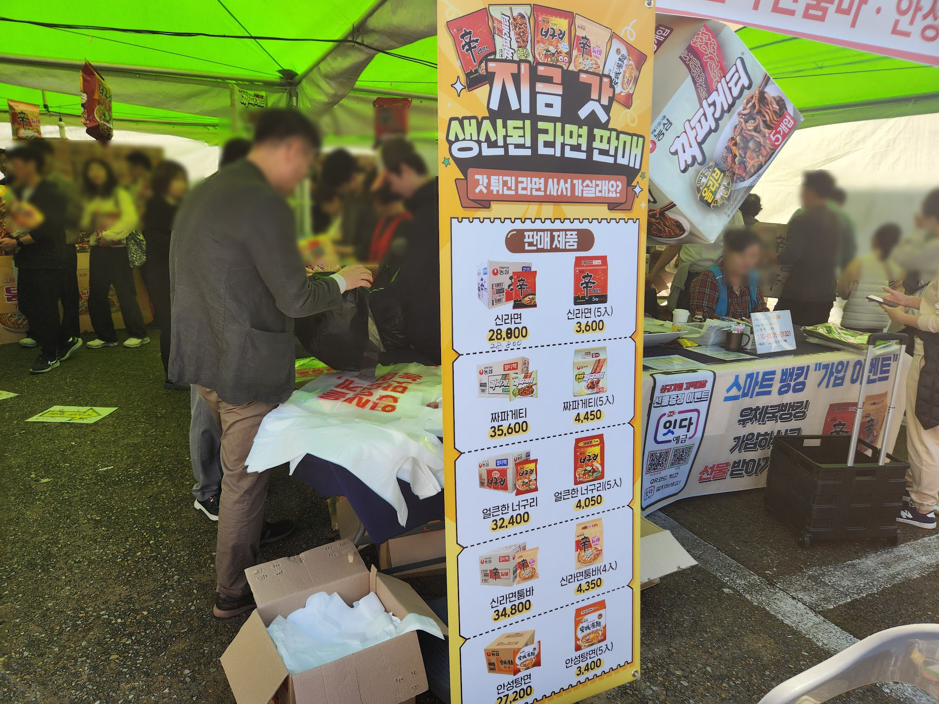 농심이 스폰서라서 농심 구미공장에서 당일에 생산한 라면을 판매하는 행사도 진행중입니다. 가격은 엄청난 특가까지는 아니더라도 꽤 괜찮은 가격입니다. 우체국과 협력해 택배 배송도 해줬습니다. 이거 끓여 먹어 봤는데, 스프야 다를 바 없지만 면이 조금 더 탱탱하게 오래 버티더군요. 다만 30분 줄을 서야 라면을 살 수 있는데, 갔을 때는 그야말로 늦가을답지 않은 더워라 햇볕에 땀을 흘리며 버텼습니다.T_T