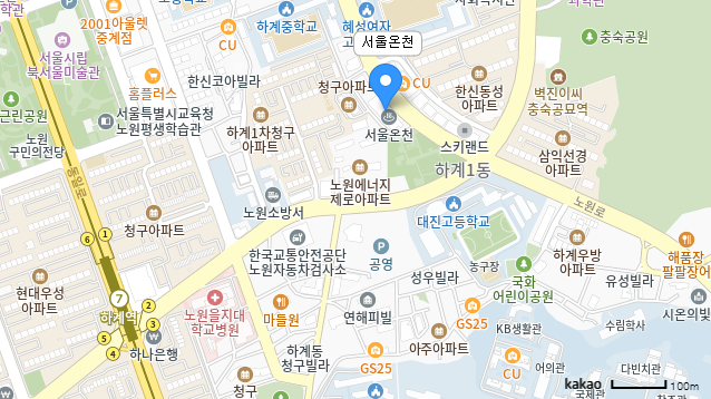 그리고 대중교통으로 오고자 하는 분을 위한 안내도 추가합니다. 서울온천은 그 이름답게 서울 한복판에 있어 대중교통으로 접근성은 결코 떨어지지 않습니다. 버스를 타고 올 경우 서울온천/하계1동주민센터 또는 골마을근린공원/대진고교 정류장에서 내리면 됩니다. 여기서 걸어서 3분 정도면 올 수 있습니다. 버스가 많이 오지는 않지만 지방과 비교하면 넘칠 정도로 오는 편이라 지역 주민들의 접근성은 나쁘지 않습니다.