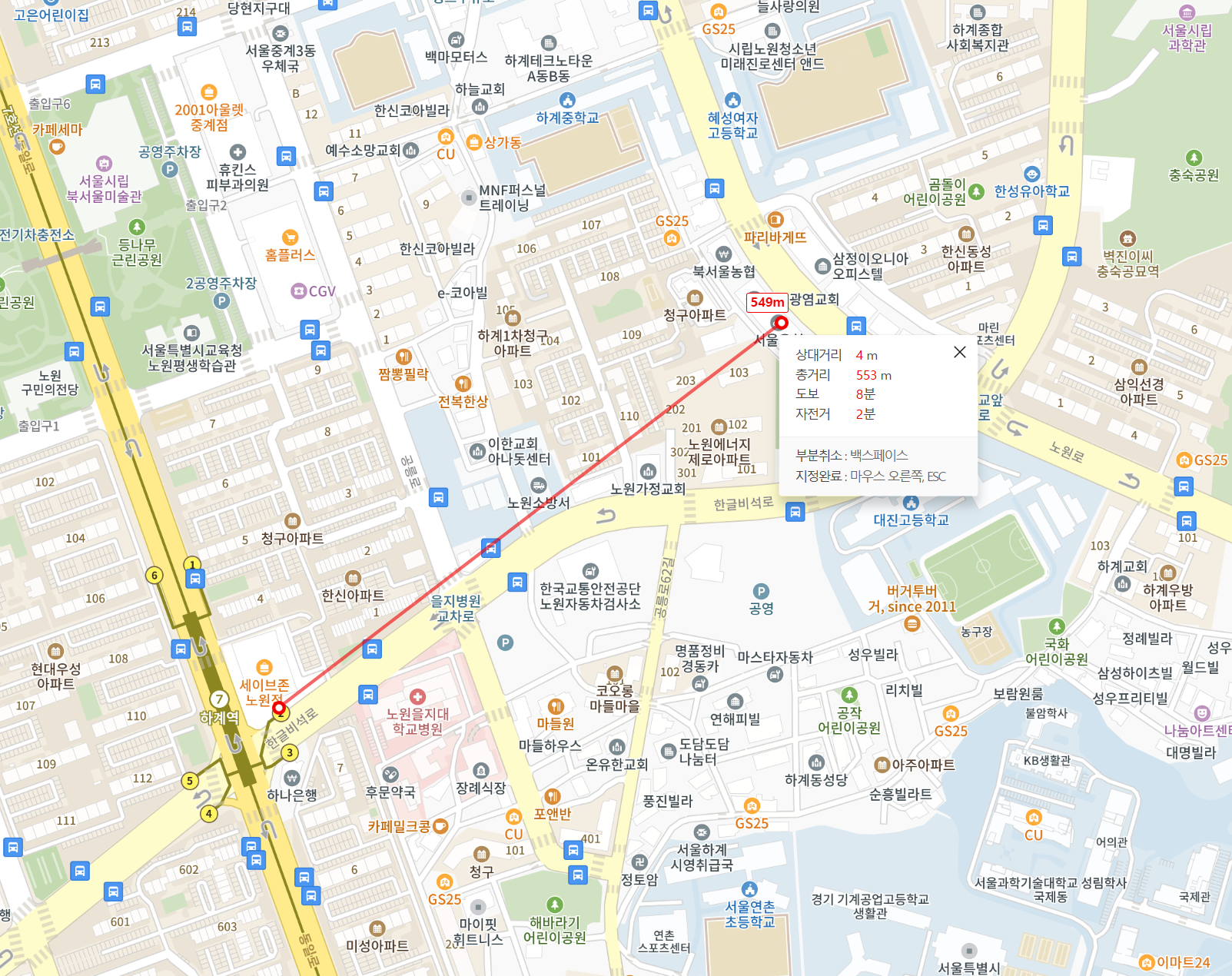 대신 지하철 접근성은 좀 미묘합니다. 위 사진처럼 하계역에서 직선거리로 550m, 실제 거리로는 700m 정도를 걸어 와야 하는데, 빨리 걸어야 10분 정도입니다. 두 블럭 정도를 걸어 와야 하기에 다리가 좀 불편한 분은 지하철만으로는 접근이 좀 어렵습니다. 다리가 튼튼해도 겨울이나 한여름에는 덥고 추워서 걷기 싫어질 거리입니다. 그렇다고 버스를 환승하기도 좀 미묘한 거리라서 확실히 지하철만으로 접근할 경우 아쉬움이 남습니다.