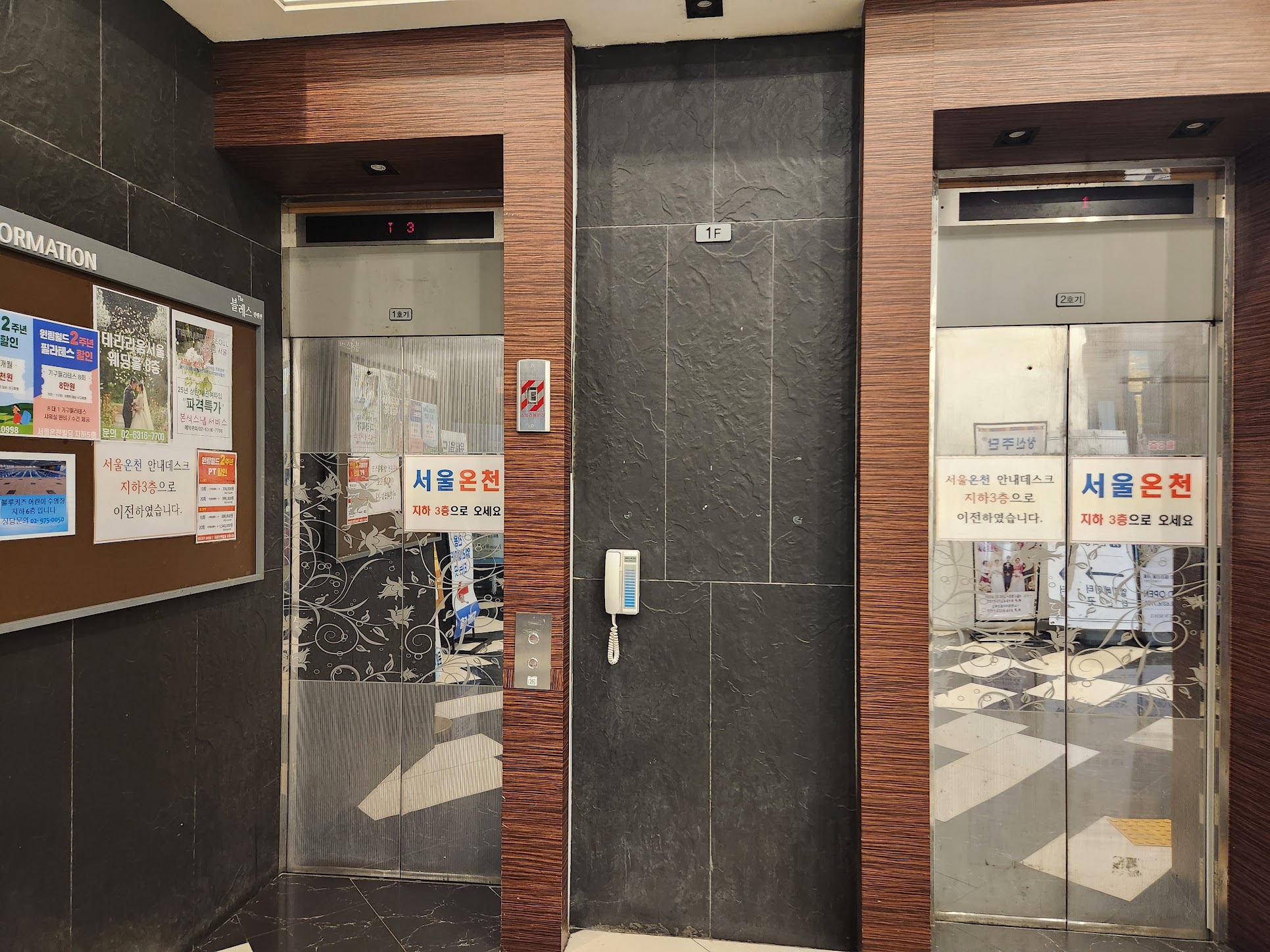 온천은 지하 3층에 있고, 엘리베이터를 타고 가야 합니다. 다만 이 때 저 두 개 가운데 오른쪽을 이용하는 것을 권장하는데, 왼쪽의 것도 가기는 하는데 나올 때 조금 혼동(?)이 있을 수 있습니다. 반대로 지하 1층에 있는 주차장을 갈 때는 저 왼쪽 엘리베이터를 이용해야만 합니다.