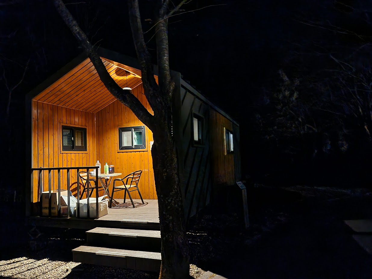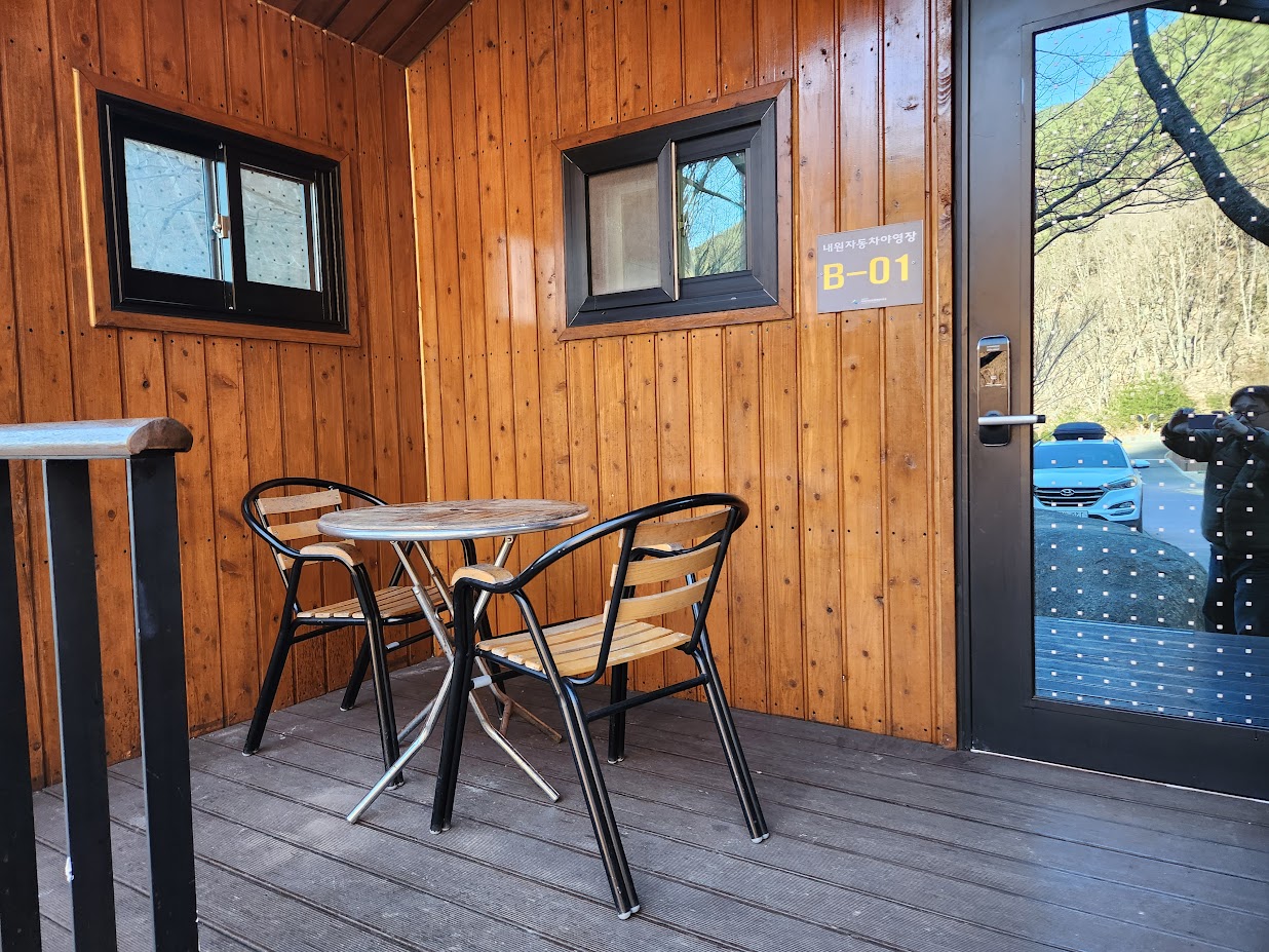전체 하우스 사진에서 보신 바와 같이 목재 테이블이 바깥에 있지만 하우스 입구에 2인용 테이블이 별도로 있습니다. 여기에는 전기 콘센트도 있어 전기밥솥같은 전기 기기 연결도 가능합니다. 텐트 영지와 달리 별도의 전기 제한은 없습니다만, 어차피 전기를 정말 많이 먹는 것은 가져올 필요가 없긴 합니다. 별도의 열쇠 없이 번호 키 형식이며 체크인 시 번호를 알려줍니다.