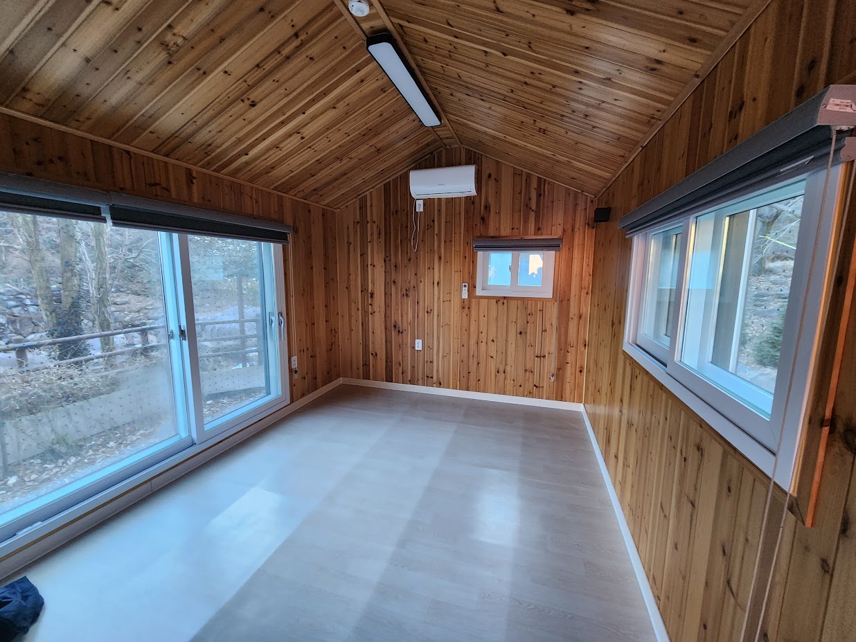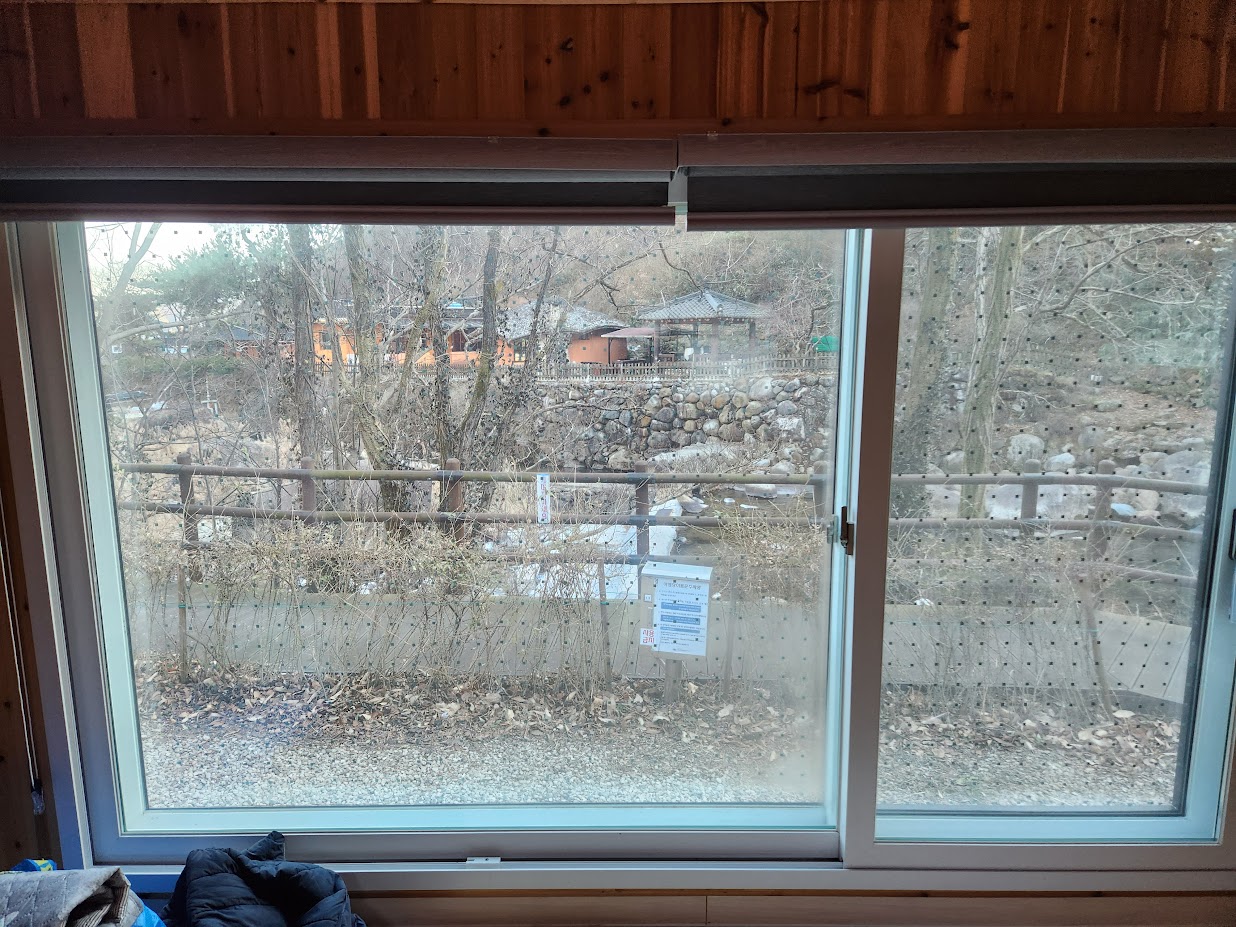 냇가쪽에 있는 하우스는 나름 뷰도 좋은데, 냇가가 바로 보입니다. 이중창이라 물소리가 안 들리는 것은 아쉽지만 물 구경을 춥지 않게 즐길 수 있습니다. 프라이버시가 중요하면 블라인드를 치면 됩니다.