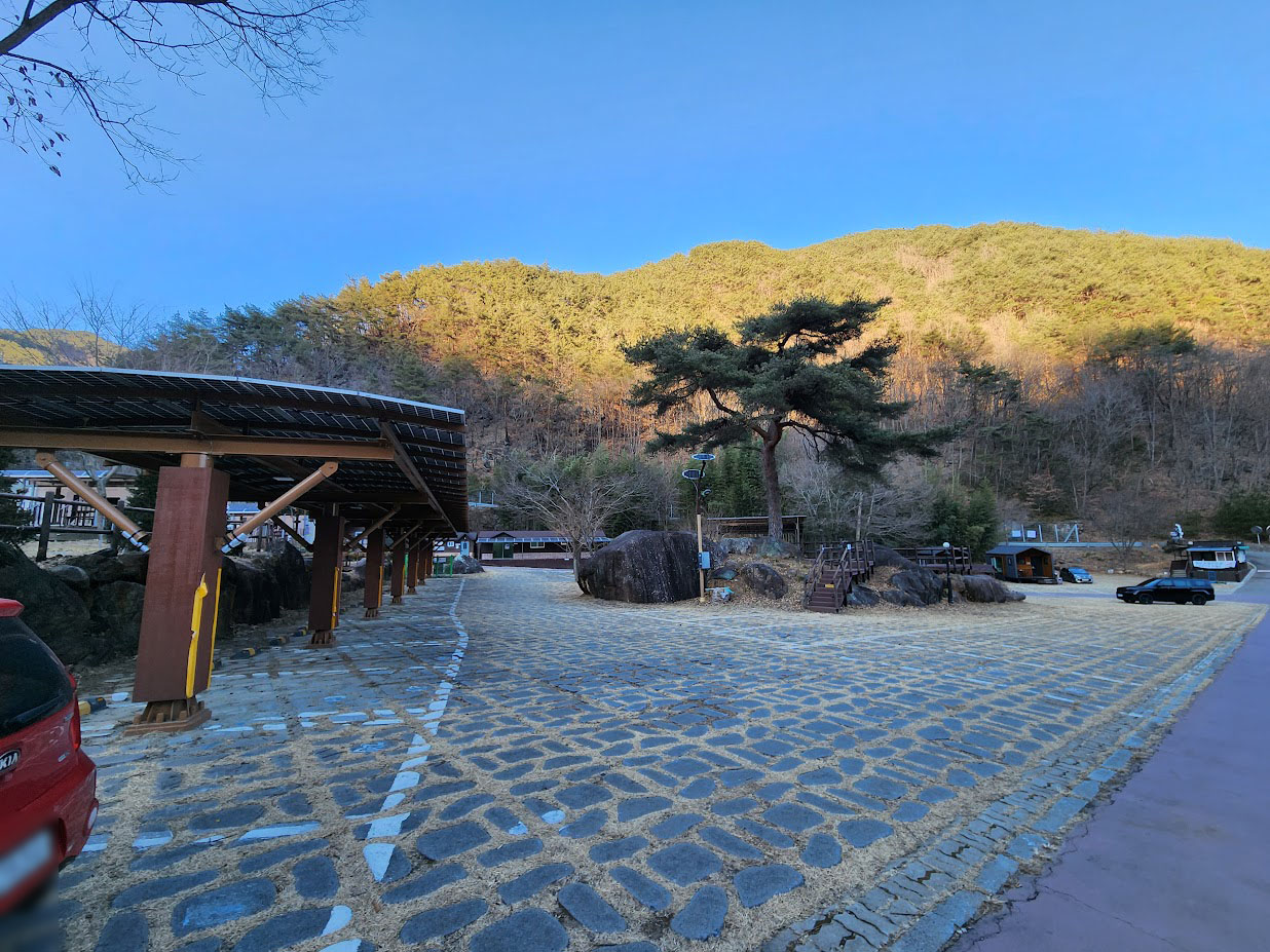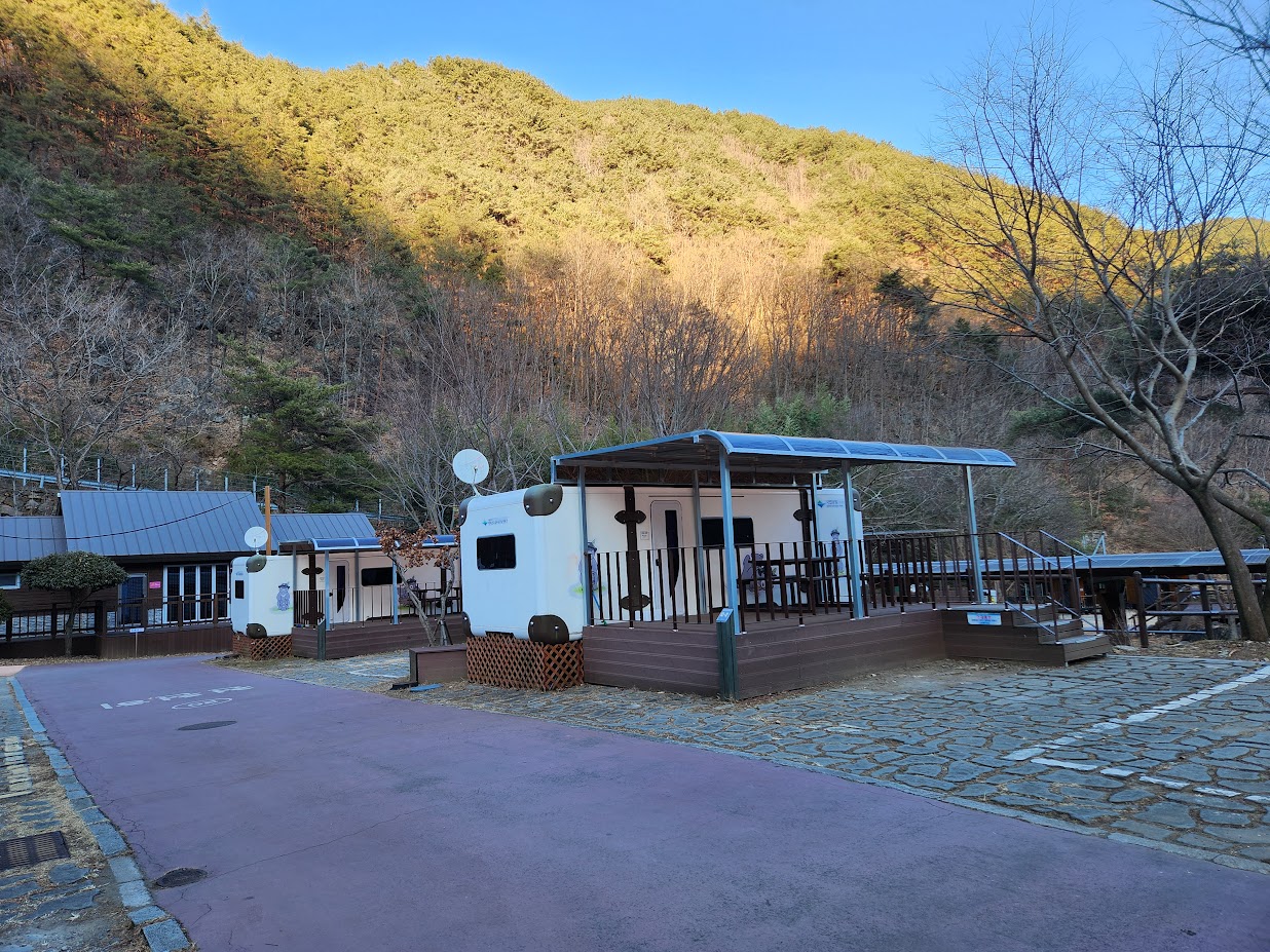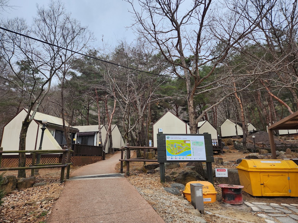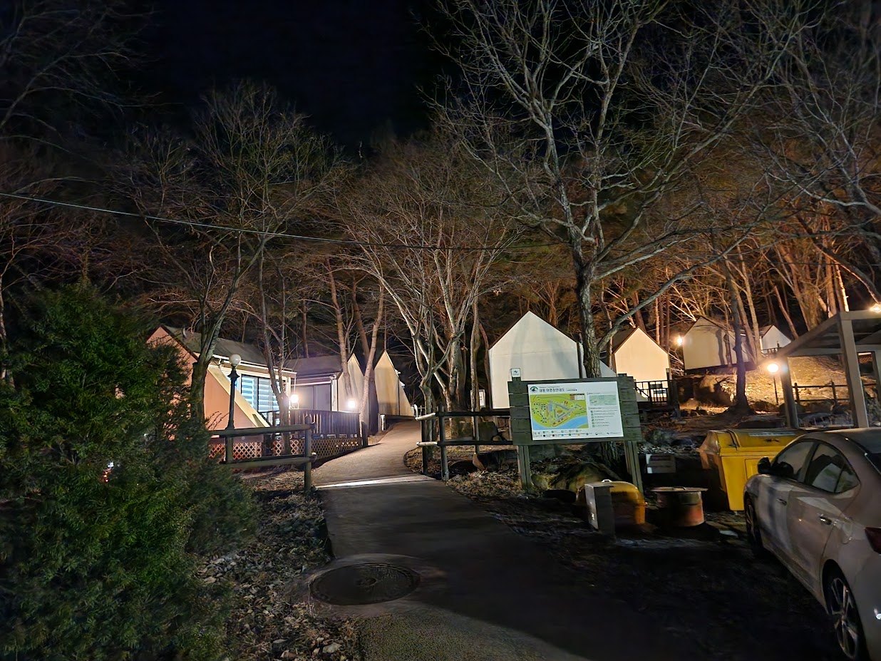 자~ 그러면 바깥으로 나가 봅니다. 6개월 사이에 뭐가 바뀔 것은 전혀 없는데, 산막텐트는 여전합니다. 동계 시즌이라서 여기는 좀 빈 곳들이 적지 않게 보이는데, 아무래도 산막 텐트는 방한 능력이 좀 떨어지는 것이 사실이니까요. 카라반은 잡을 수 있다면 하우스 이상으로 좋지만, 내원 캠핑장의 카라반이 달랑 두 개 뿐이라 여기를 잡는 것은 그야말로 미션 임파서블 레벨입니다.T_T