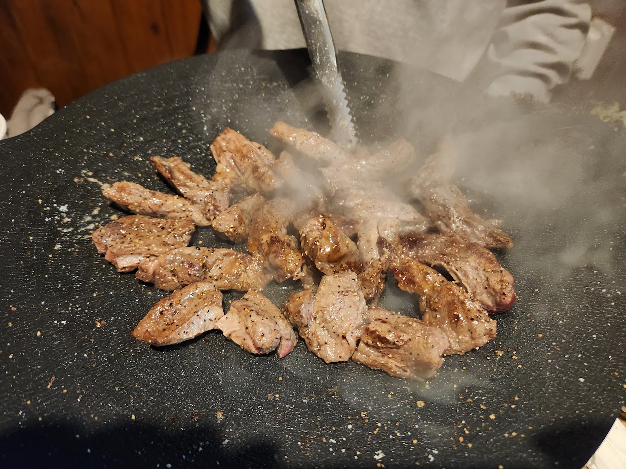 사실 여기에 쇠고기가 한 팩 더 준비되어 있었으나 간식을 너무 많이 먹었다는 이유로 그냥 갈비살만 잘 구워 야채를 있는대로 더해 쌈을 만들었습니다. 다만 영하로 떨어진 바깥에서 고기를 구워야 하니 추운건 어쩔 수 없습니다. 실내에는 화재 경보기 도배가 되어 있어 절대 뭘 굽거나 해서는 안 됩니다.T_T