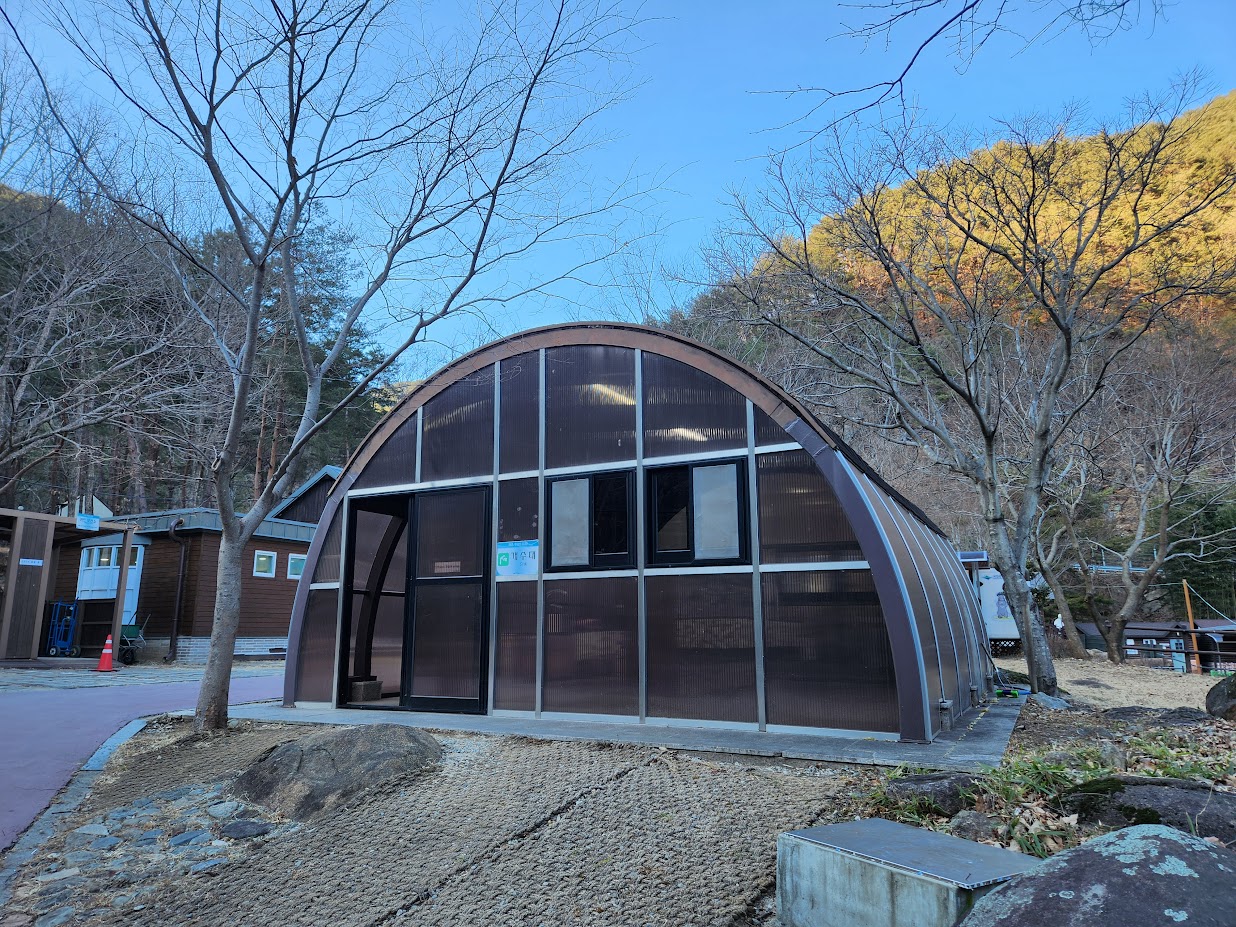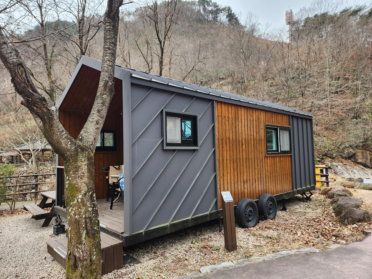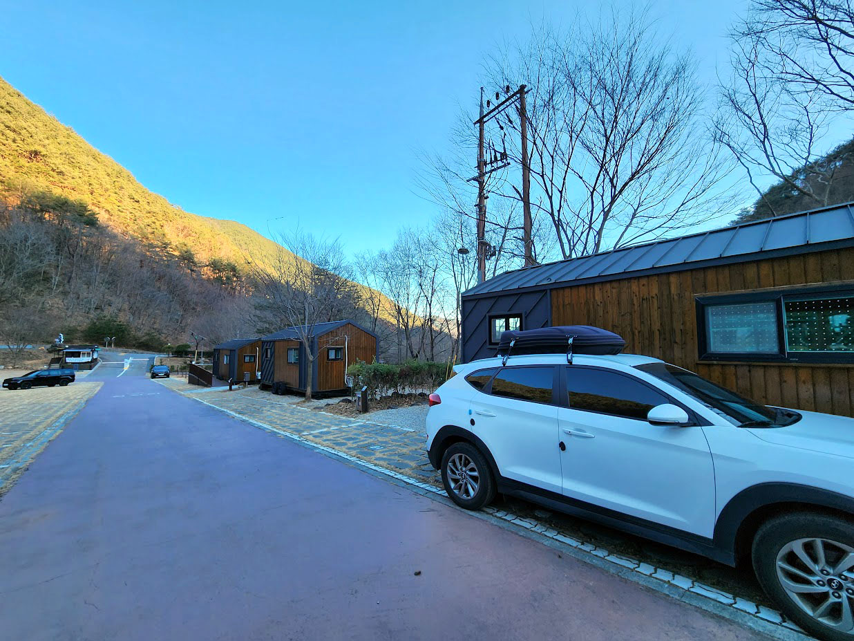 이전 포스팅에서 산막텐트 형식의 하우스는 그 구조를 설명을 드린 바 있고, 이번에는 여기가 아닌 나무 구조의 하우스를 잡았습니다. 총 6동이 있고, 4동이 냇가를 따라 배치되어 있고 나머지 두 동은 관리동쪽에 배치되어 있습니다.