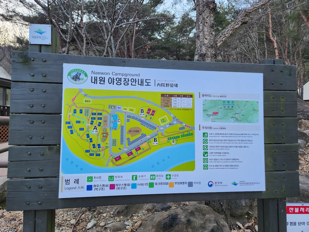 이전에 내원 캠핑장을 소개할 때 자세히 적은 바 있지만, 이 캠핑장은 지리산 주변 캠핑장 가운데서도 좀 특이한 곳입니다. 일반적인 텐트 캠핑이 아닌 '하우스' 중심의 캠핑장이라는 것인데, 안내도 오른쪽의 텐트 사이트 8개를 제외하면 나머지는 전부 하우스 아니면 카라반입니다. 즉 이 캠핑장 자체가 기본적으로 기후에 크게 영향을 받지 않는 캠핑이 가능한 곳입니다. 물론 소수지만 일반 영지도 있고, 전부 데크 영지라 편하며 계곡 옆이라 물소리도 듣기 좋다는 나름 장점이 있습니다. 개수대까지 정말 먼 것만 빼면 말이죠.T_T