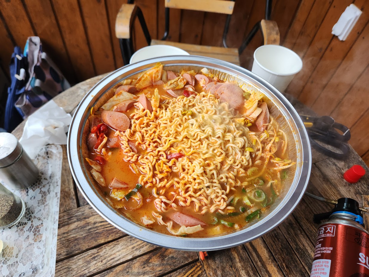 다만 이번에는 제대로 된 전문점 존슨이 아닌 그냥 마트표 싸구려(?)를 골랐는데, 그 전에 식자재를 준비하러 마트에 갔을 때 할인이 붙어 있기도 했으나 냄비 포함이라 설겆이가 간편하다는 이유 때문이었습니다. 햄이 적고 야채만 많은게 흠이지만 어차피 목적은 국물이니까요. 정말 두 명이서 냄비 바닥까지 싹 털어 밥을 비벼 먹었습니다. 텐트가 없다는 것 만으로도 정리가 쉬워 20분만에 모든 철수 준비를 끝내고 차에 몸을 실었습니다. 열심히 또 차를 몰고 와 집에 가서 기절했다는 것은 더 이상 비밀도 아닙니다만.T_T