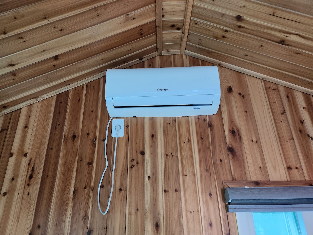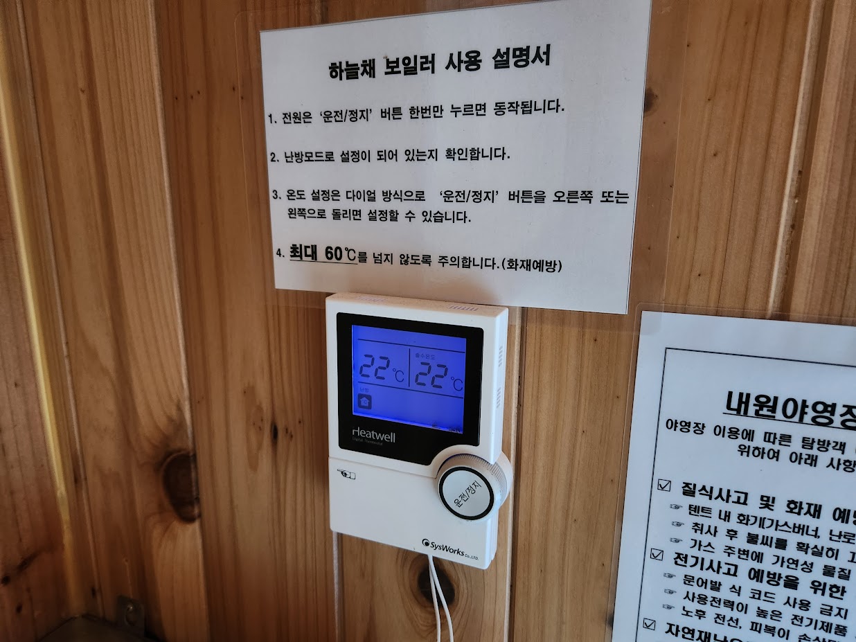 일단 하우스라서 냉난방 설비는 기본적으로 갖춰져 있습니다. 산막텐트와 동일하게 난방은 전기온돌을 사용하는데, 실내온도 조절식이 아닌 표면 온도 설정식이라 따뜻하게 지내고자 한다면 50도 이상으로 설정을 하셔야 합니다. 지금 계절에는 쓸 일은 없으나 제대로 된 벽식 에어컨도 있습니다. 시끄러운 이동식 에어컨으로 버텨야 하는 산막텐트보다는 압도적으로 낫습니다.T_T