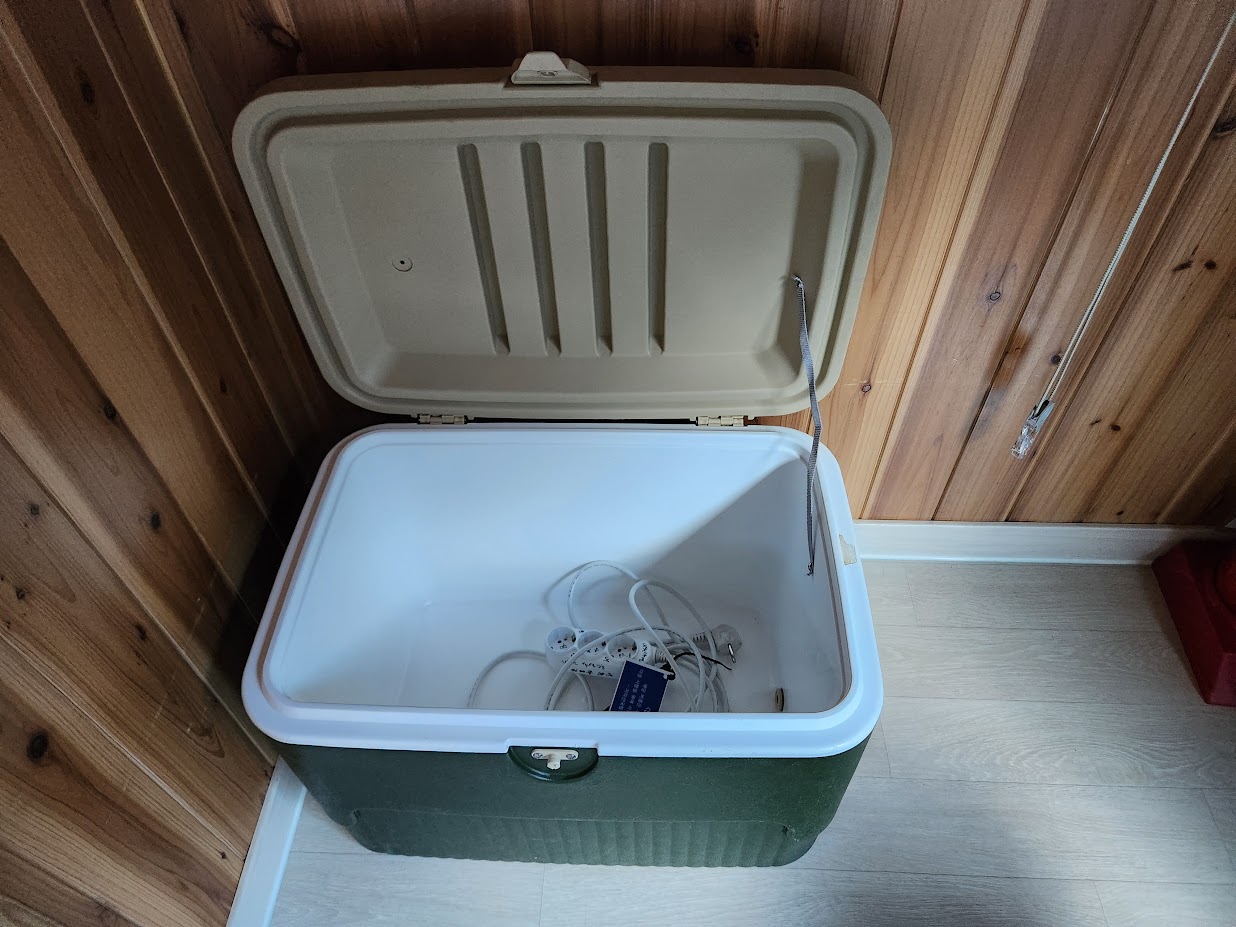다만 냉장고가 없는 것은 산막텐트나 여기나 똑같아 아이스박스로 버텨야 합니다. 멀티탭 제공 역시 동일합니다. 물론 지금같은 계절에는 자연 냉장고(즉 바깥)에 내놓는 것이 훨씬 신선도 유지에 도움이 됩니다. 아무리 남쪽이라도 바깥에 내놓은 물병에 살얼음이 낄 정도로 춥습니다.