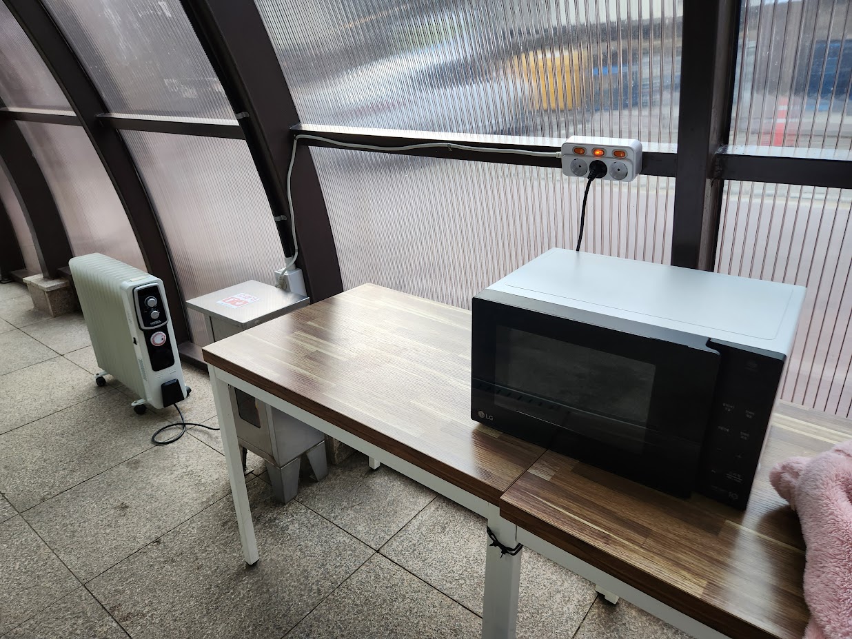 개수대 안에 세면장과 개수대가 공존하는 구조이며, 겨울 버전이라 실내에 라디에이터도 설치되어 있습니다. 물은 전기 온수기로 덥혀 나오는 구조라 용량이 작아서 펄펄 끓는 뜨거운 물을 쓰기는 좀 어렵고, 대신 손이 얼지 않을 정도의 미지근한 물은 나옵니다. 전자레인지도 있으니 잘 활용하시면 음식 준비가 훨씬 편해집니다.