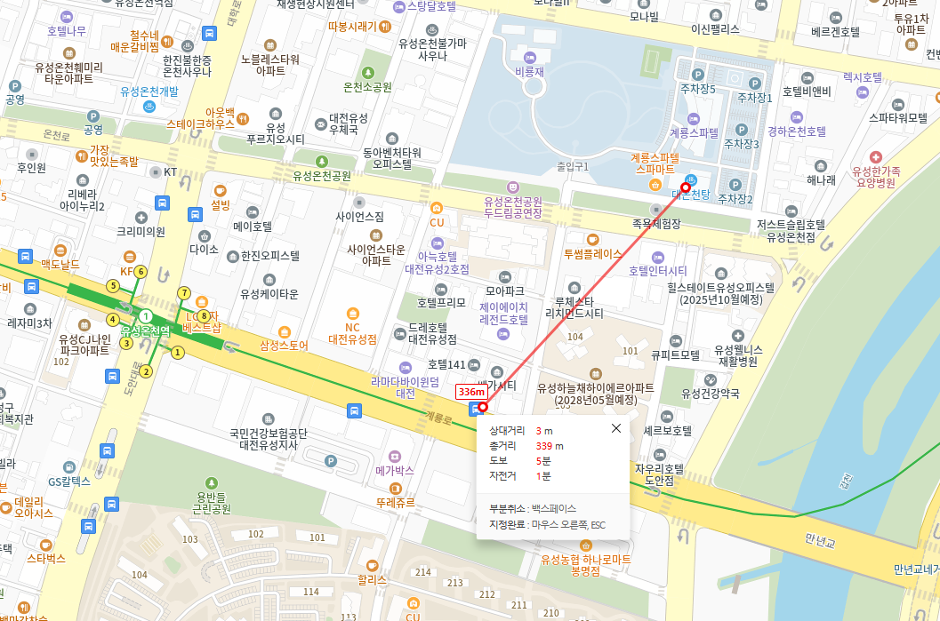 추신: 유성온천이 있는 봉명동은 유흥가로는 예전같지는 않지만 그래도 대전 전체에서는 나름 입지가 괜찮은 편입니다. 저기 지도 오른쪽의 만년교를 건너면 현 대전의 핵심지역인 둔산신도시로 가며, 온천 바로 북쪽은 충남대학교와 KAIST가 있습니다. 그리고 온천 아래로는 길게 도안신도시로 이어집니다. 서쪽으로는 계룡산(수통골, 동학사) 가는 길이구요. 그래서 나름 교통도 나쁘지 않게 되어 있는데, 계룡스파텔 바로 앞으로 가는 버스는 없어도 조금만 걸어 나오면 버스를 어렵지 않게 탈 수 있습니다. 또한 조금 더 걸으면 대전 1호선 지하철을 탈 수도 있는데, 버스정류장까지는 5분, 지하철역까지는 10분 정도 걸립니다. 그래서 대전 거주민이 여기에 대중교통만으로 오는 것은 그리 어려운 일은 아닙니다.
