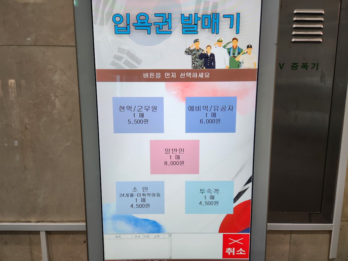 대한민국 3대 온천에 최대 규모라 하니 나름 비싸겠다 생각하실 분이 안 계시지는 않을 것으로 보이지만, 나름 군 시설이라 생각보다 요금은 저렴합니다. 온양온천만큼은 아니지만 할인 한 푼 안 받은 일반인도 8,000원 정도이며 육군 현역이나 군무원은 정말 온양온천 레벨로 할인이 붙습니다. 키오스크로 표를 끊어서 남탕 기준으로 지하를 내려가면 되며, 전반적인 라커룸 규모는 그냥 중대형 목욕탕 수준입니다.